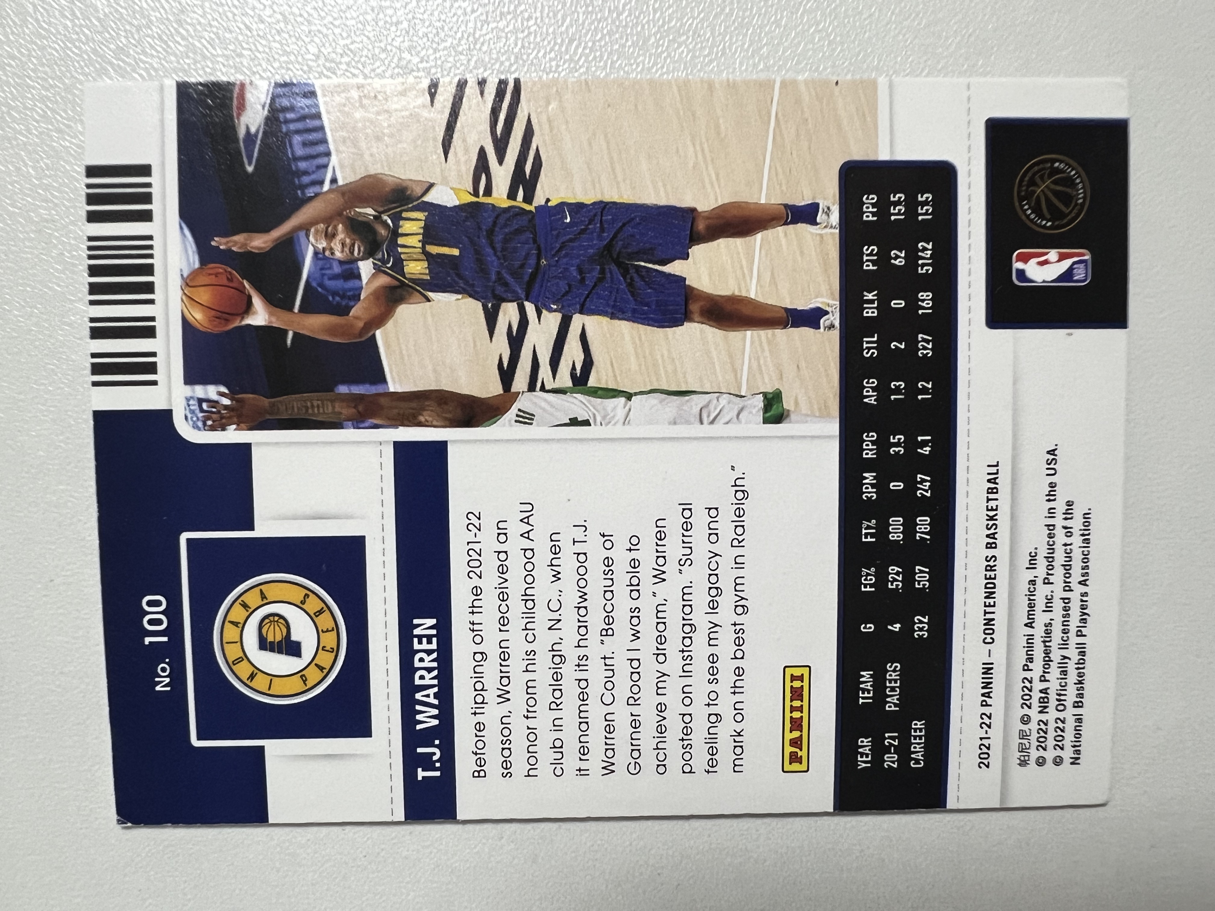 2021-22 Panini Contenders T.J. Warren #100 TJ 沃伦 步行者 球票系列 base 收藏凑套 卡品如图