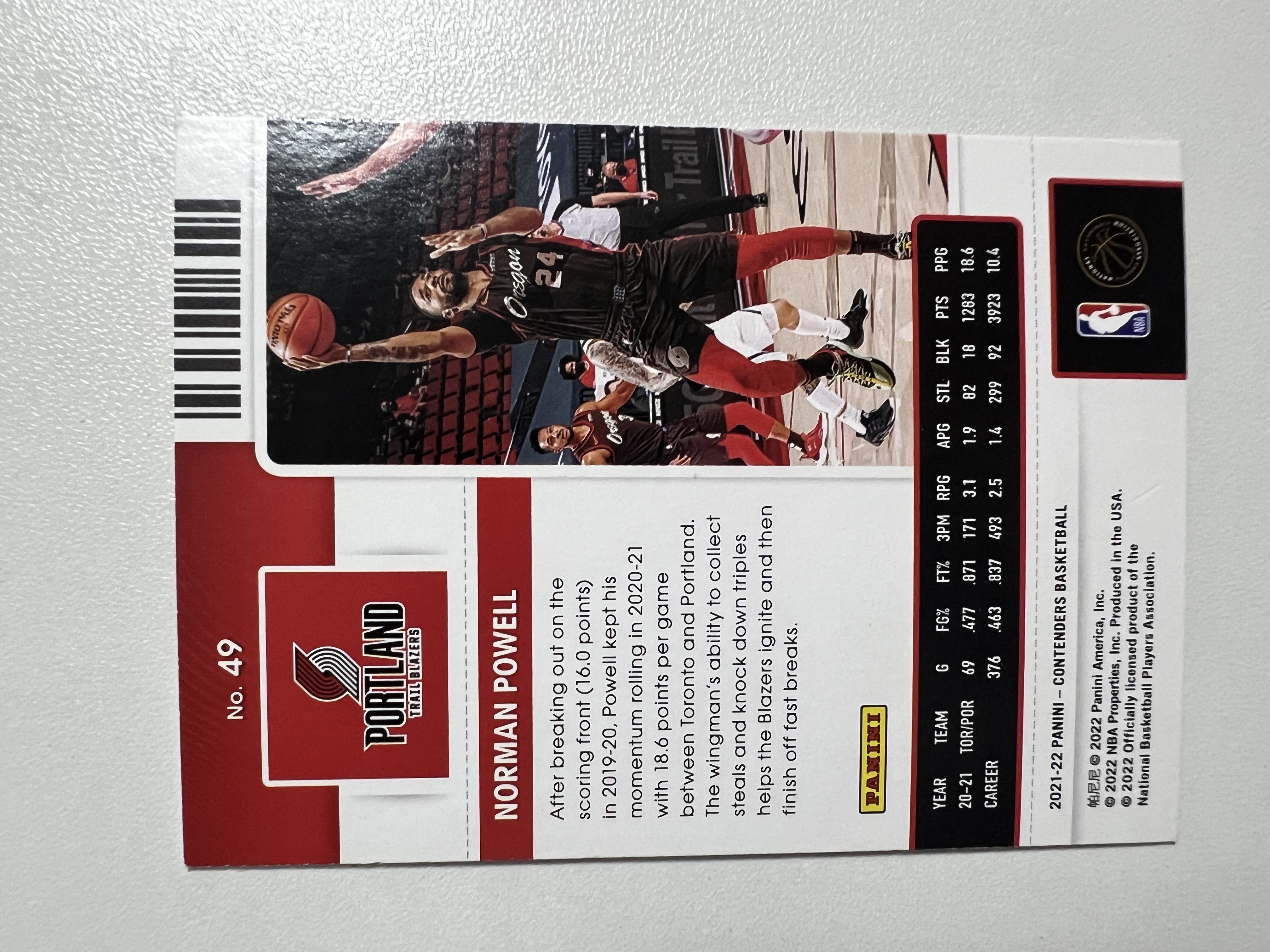 2021-22 Panini Contenders Norman Powell #49 诺曼 鲍威尔 开拓者 球票 base 收藏凑套 卡品如图