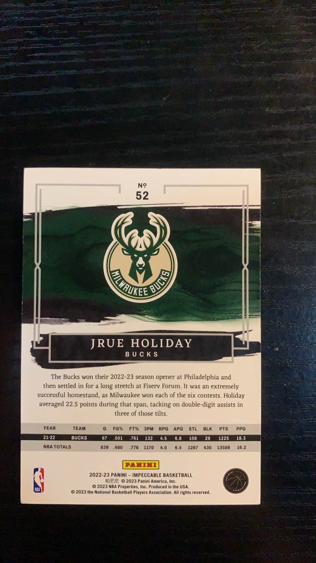 2022-23 Panini Impeccable Jrue Holiday  小真金系列 雄鹿队朱 霍乐迪  base 12/75  专收必备 用户