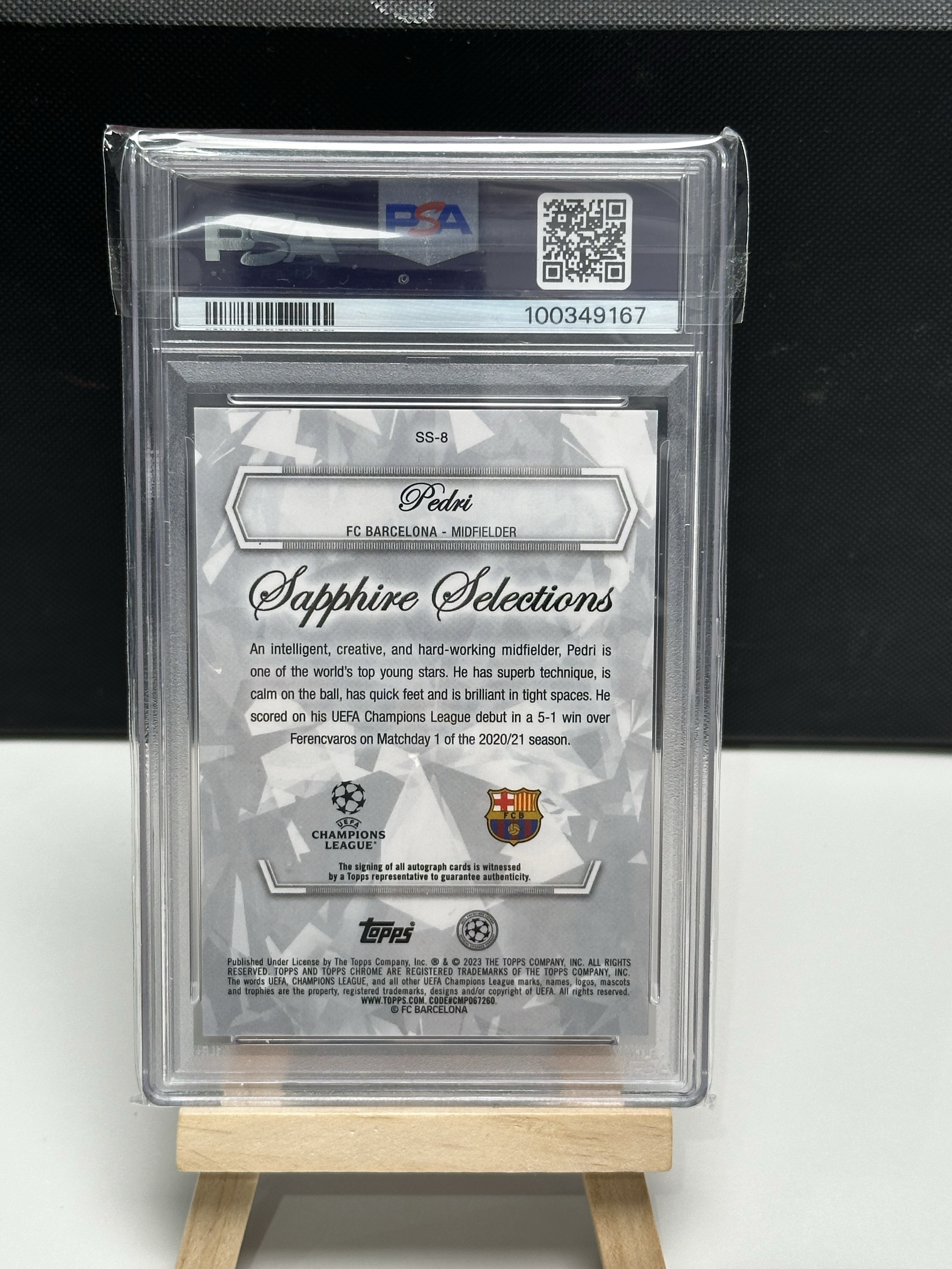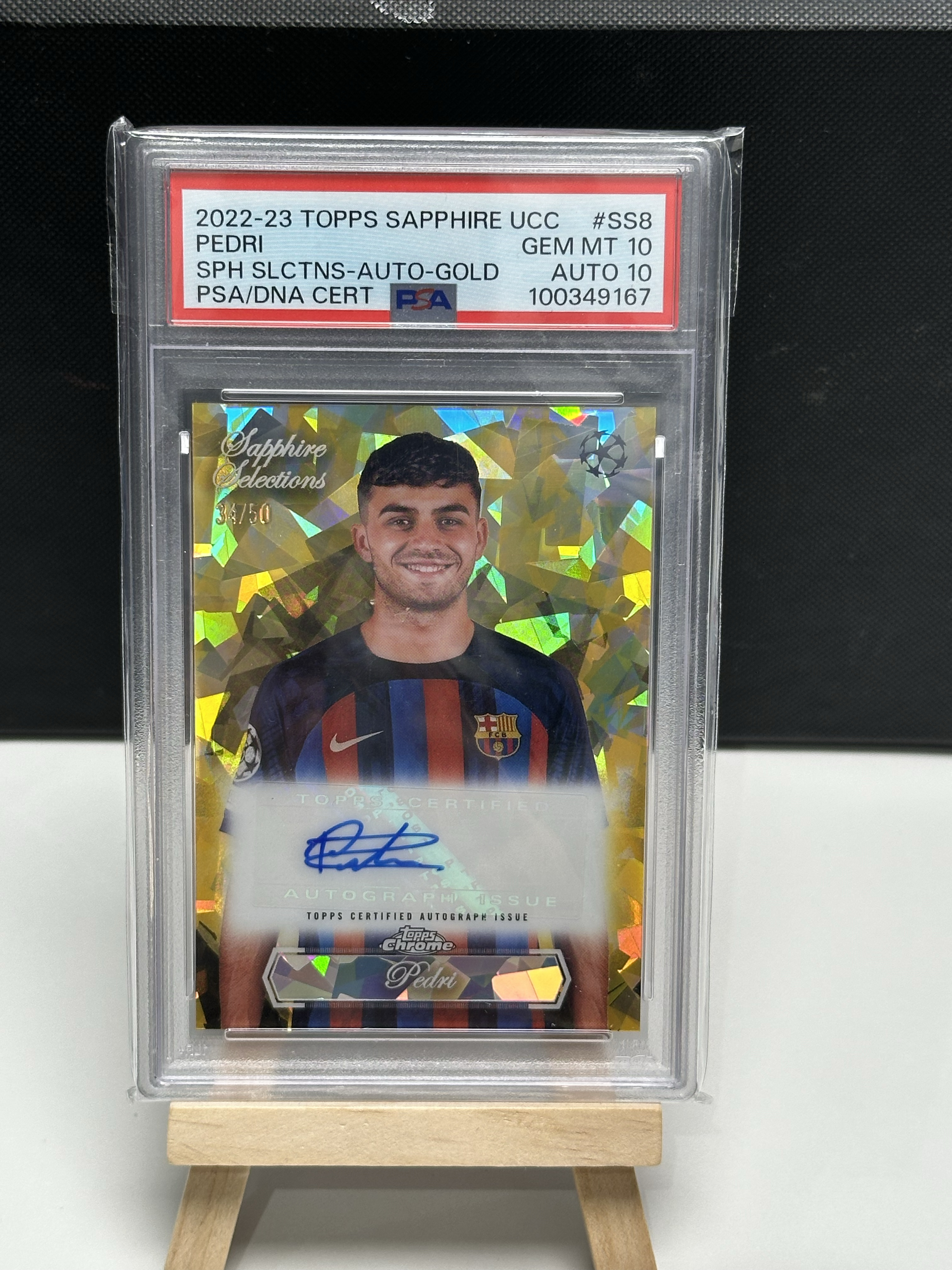 2023 Topps Chrome Pedri 欧冠 蓝宝石 巴萨 巴塞罗那 佩德里 佩刀 精选特卡 签字 金碎冰折射 34/50编 大比例 SP PSA双10分【卡品如图 不累计 不到付】