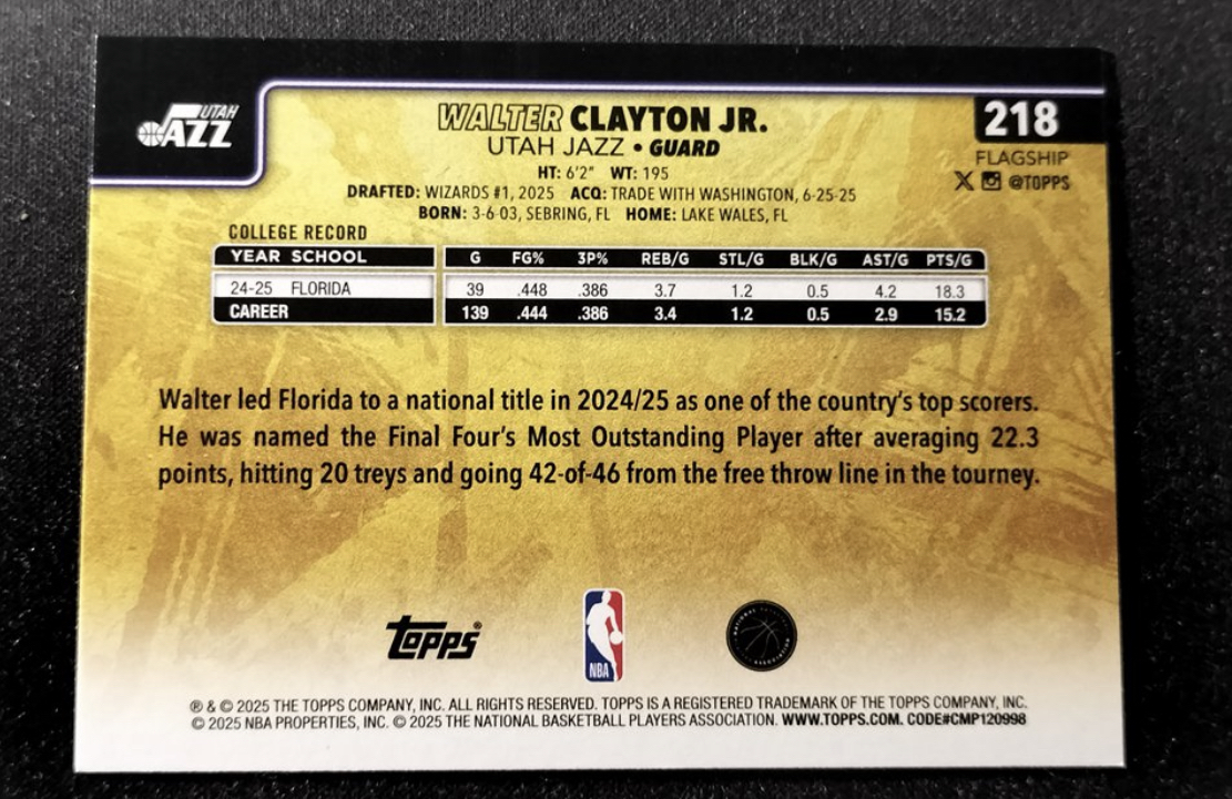 2025-26 Topps Chrome Walter Clayton Jr. RC Walter Clayton Jr. 新秀RC 小沃尔特 克莱顿 爵士 变化版 Base 金背 大比例