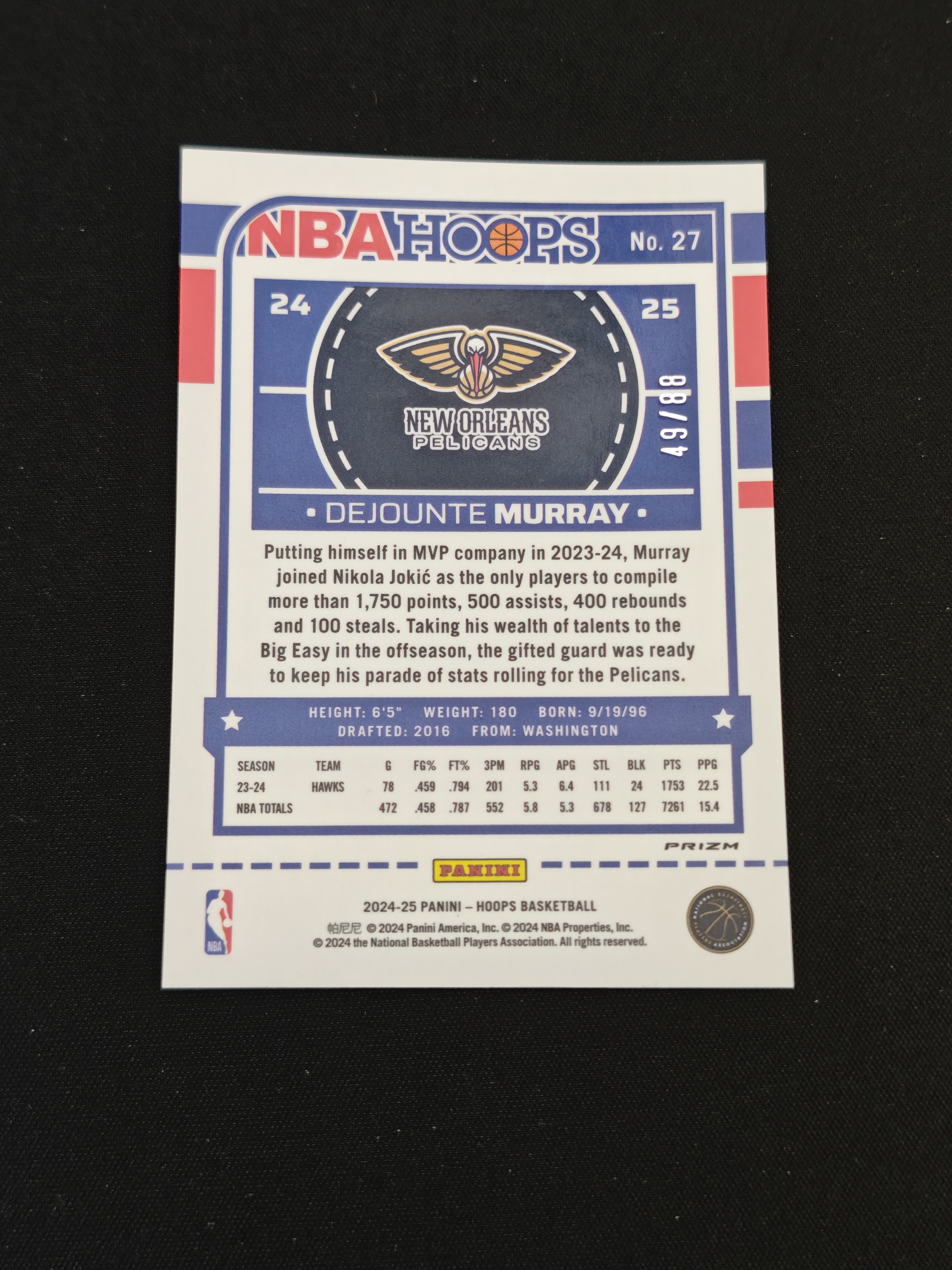 2024-25 Panini NBA Hoops Dejounte Murray 【小V代拍】德章泰 穆雷 鹈鹕 带编 49/88编 蓝碎冰折 冬日 卡片如图【随缘】j
