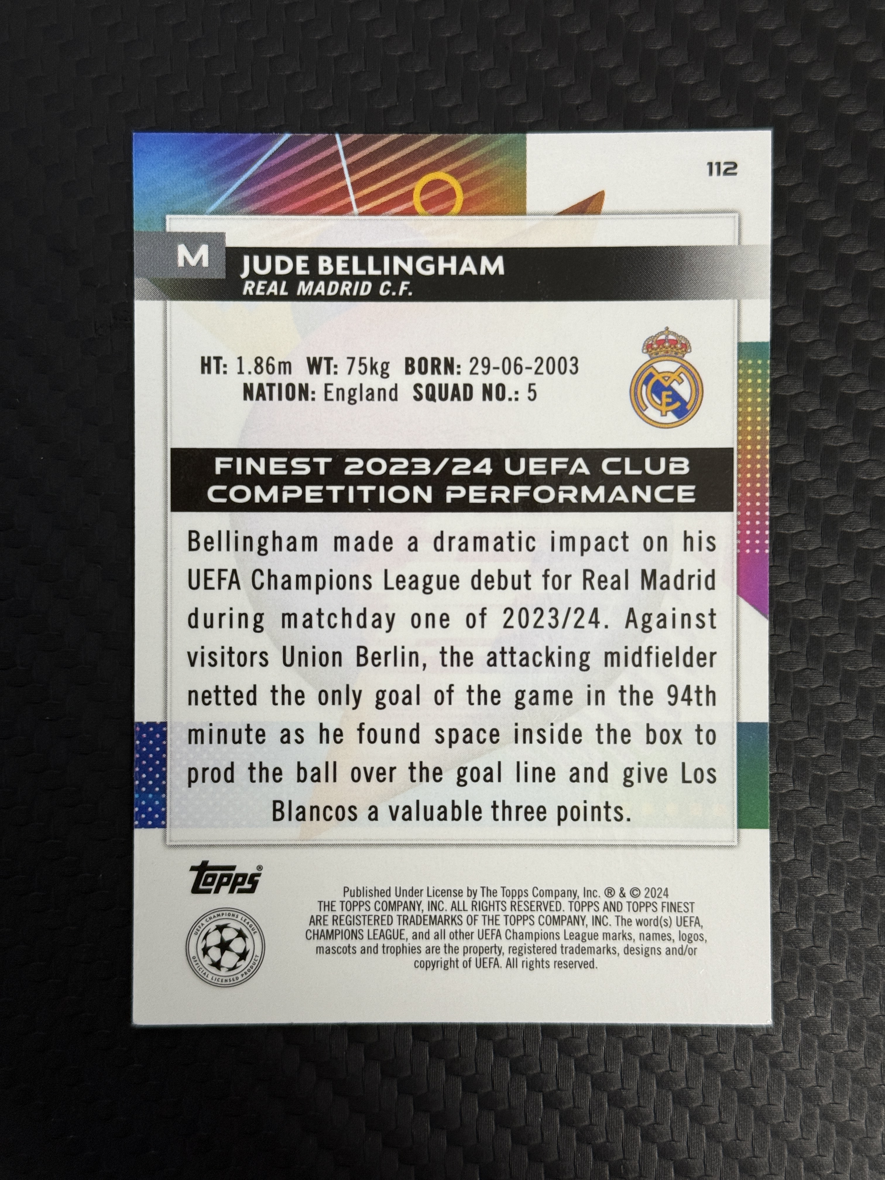 2023-24 Topps Finest Jude Bellingham 【包来拍卖】贝林厄姆 大英帝星 英格兰 皇马 多特 Base 222/275编 蓝折 UEFA 欧冠 卡品如图 吴总