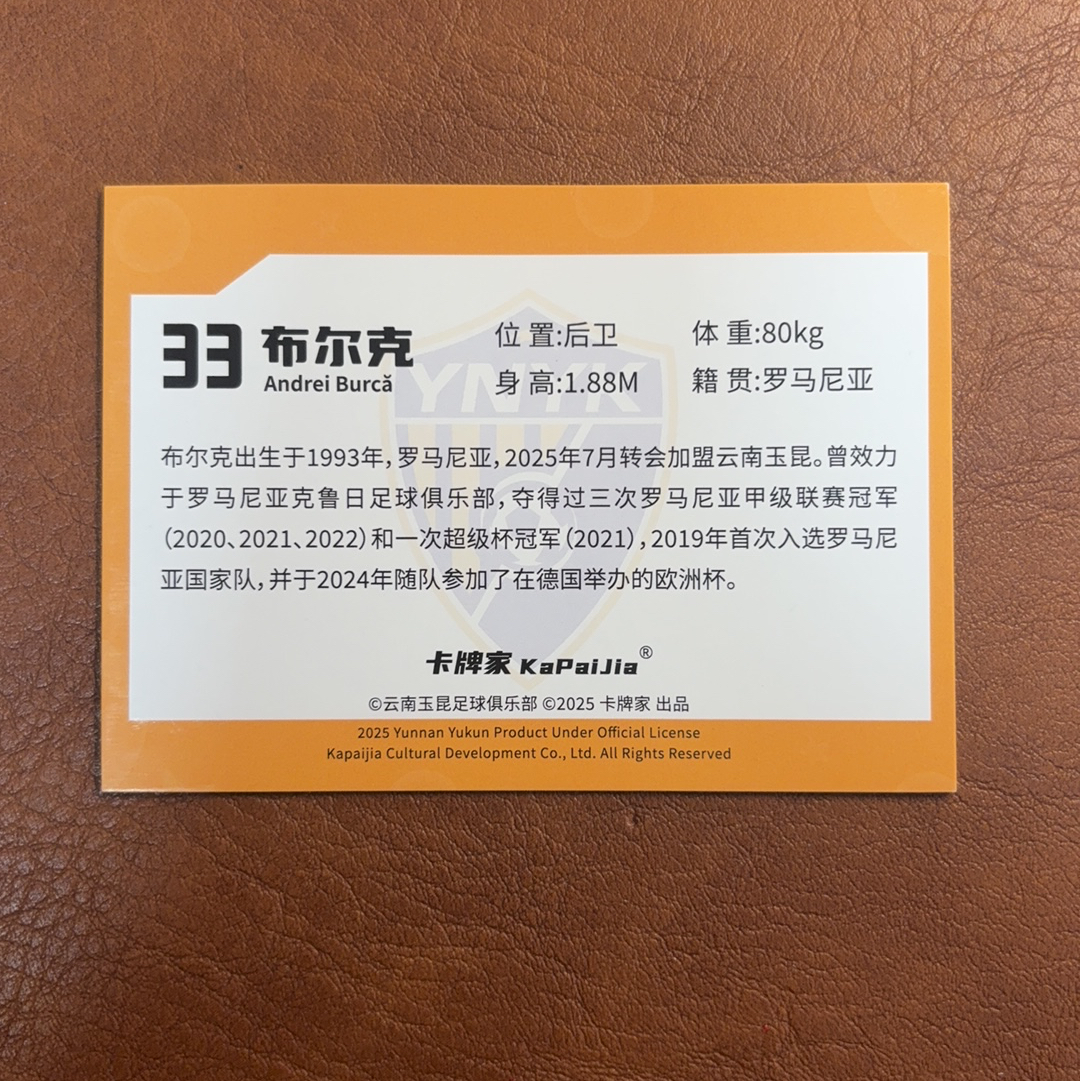 2025 卡牌家 云南玉昆队盒 Andrei Burca 【耳朵拍卖】云南玉昆 布尔克 罗马尼亚 橙碎冰折 限量 低编 4/15编 实卡精美 收藏必入 微瑕见图 CR7