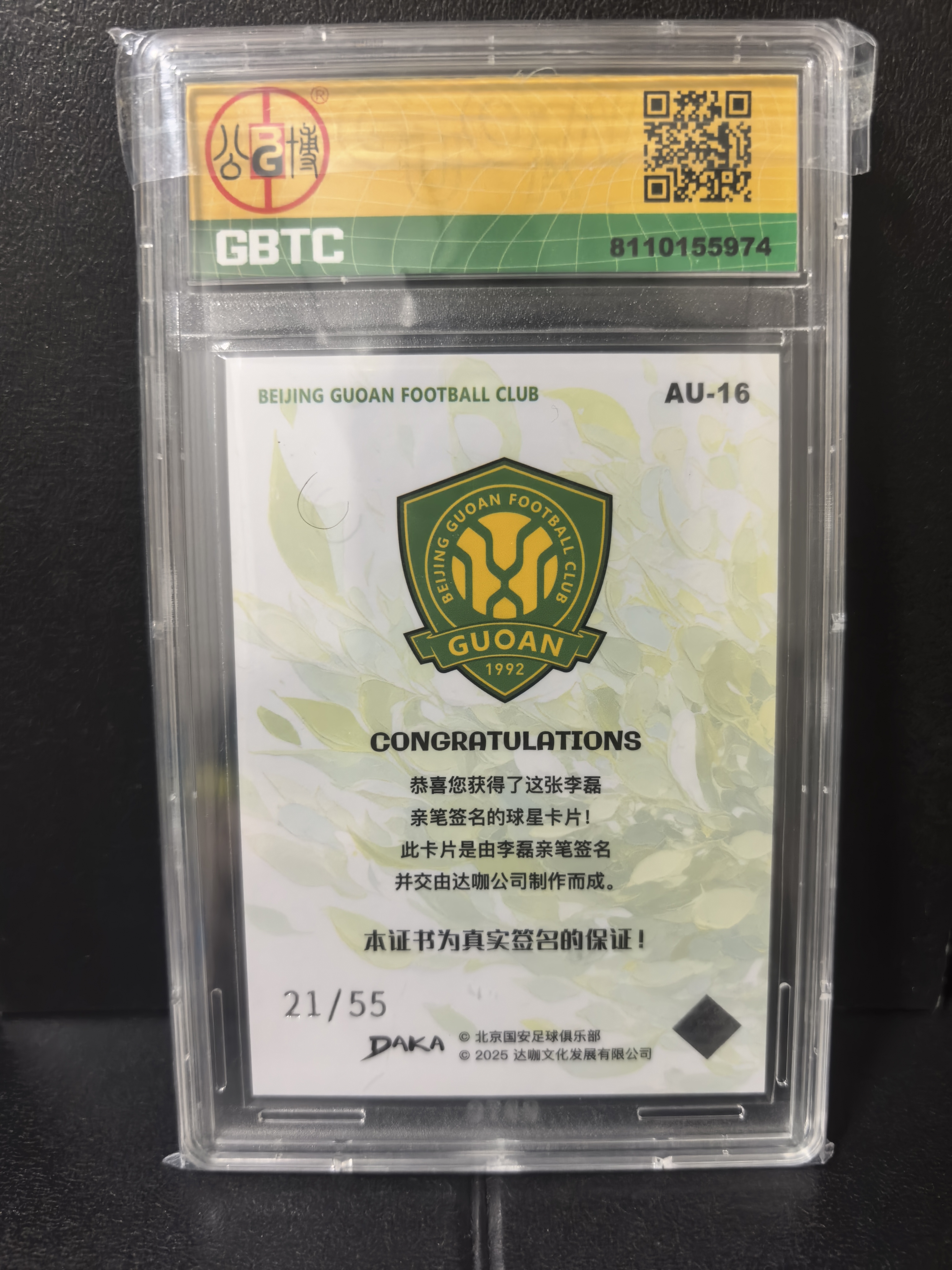 2025 DAKA AUTOGRAPH-SILVER 李磊 2025 Daka Beijing Guoan 达咖 北京国安队盒 李磊 21/55编 签字 GBTC评级 签字10分 卡品9分 卡品如图