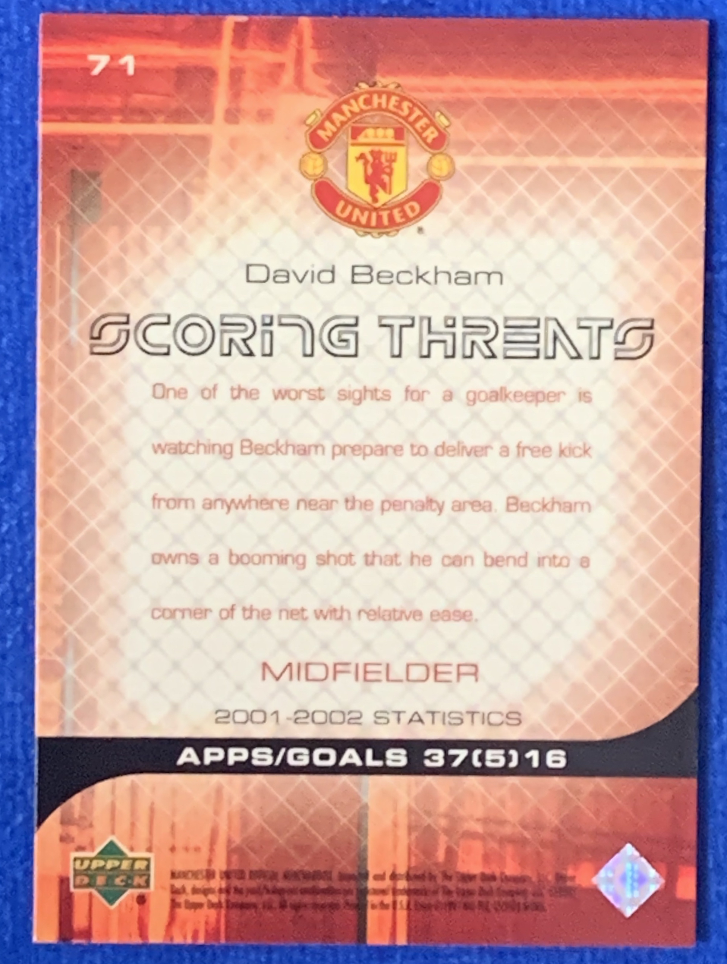 2002 Upper Deck Manchester United David Beckham 亚德得分能力特卡 曼联 贝克汉姆 92班 三冠王 英格兰England队长 圆月弯刀 皇家马德里 巴黎