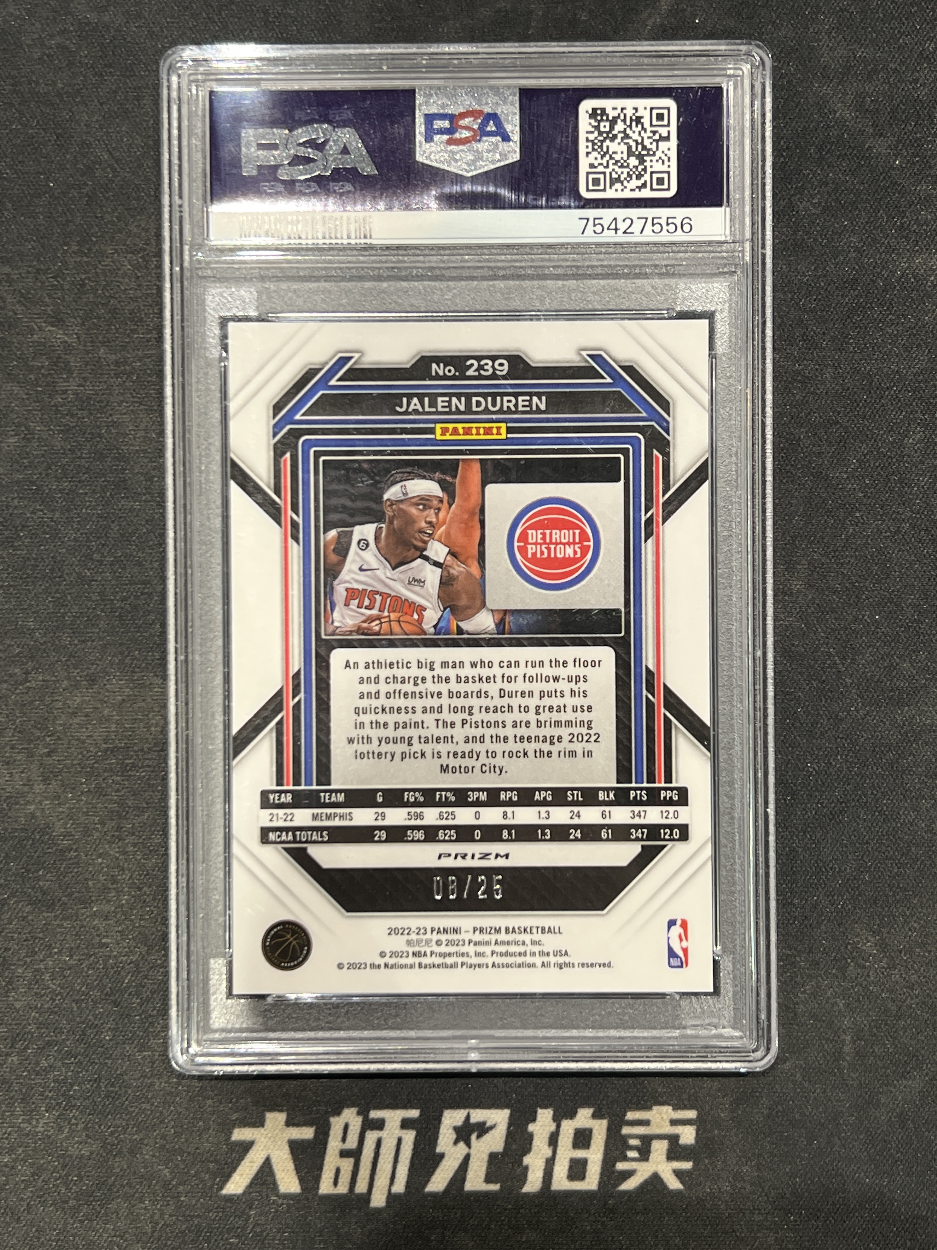 【大师兄拍卖】2022-23 Panini Prizm Jalen Duren 活塞 杰伦杜伦 新秀RC 25编 mojo折 base折射 PSA评级卡 9分-马文-