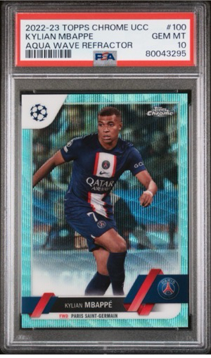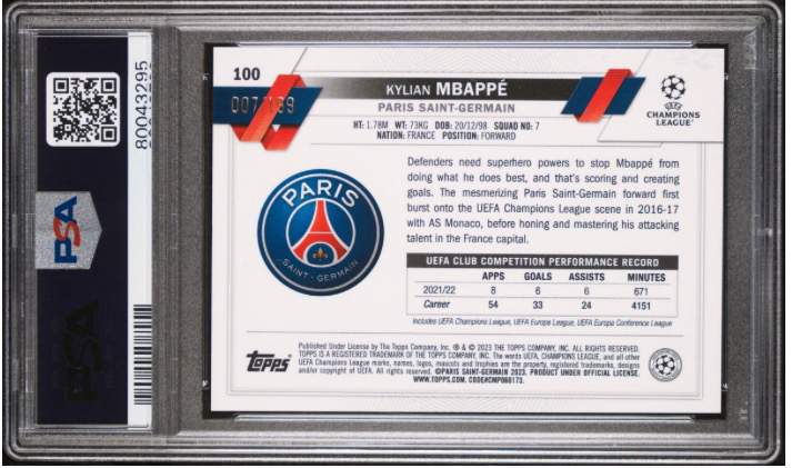 2022-23 Topps TOPPS CHROME UEFA CLUB COMPETITIONS Kylian Mbappe 法国 巴黎 姆巴佩 007/199编 同背 青波纹折 PSA10分