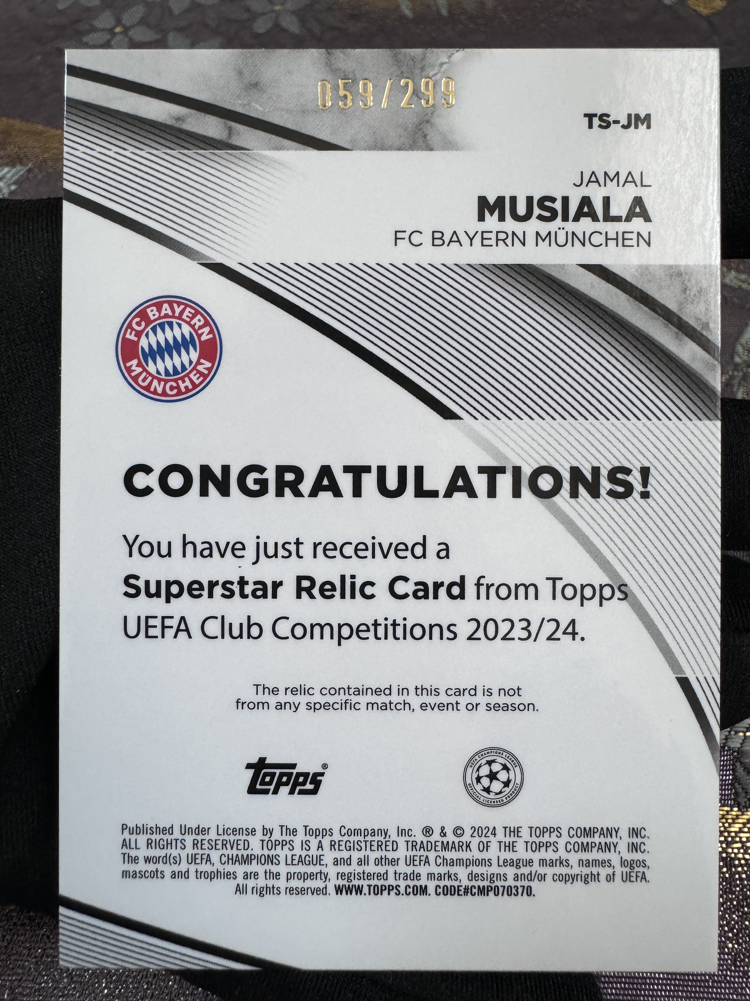2024 Topps UCC Jamal Musiala 欧冠 UCC 德国 拜仁慕尼黑 顶级天才 当红炸子鸡 小鹿 穆夏拉 投资大热 单窗物料切割 球衣patch 紫平行 059/299编 实卡精美
