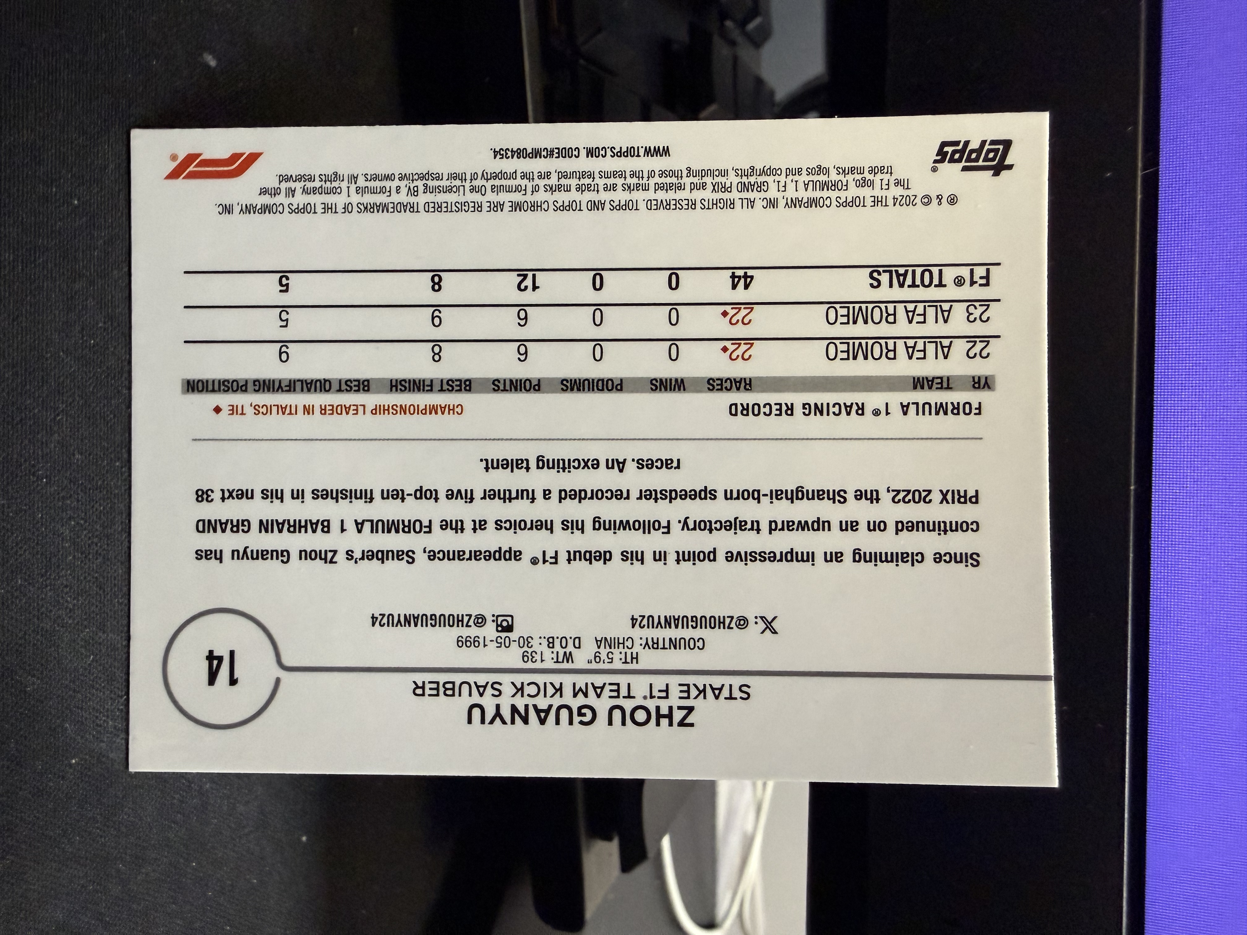 2024 Topps Chrome Guanyu Zhou 周冠宇 中国骄傲 法拉利 车手 定妆照 定妆 粉折 142/225 卡品如图