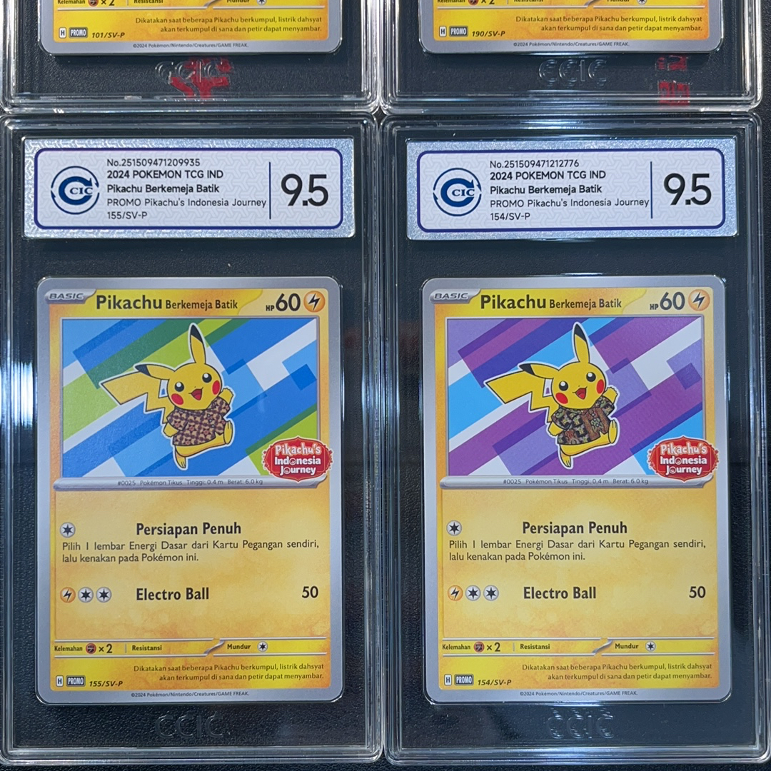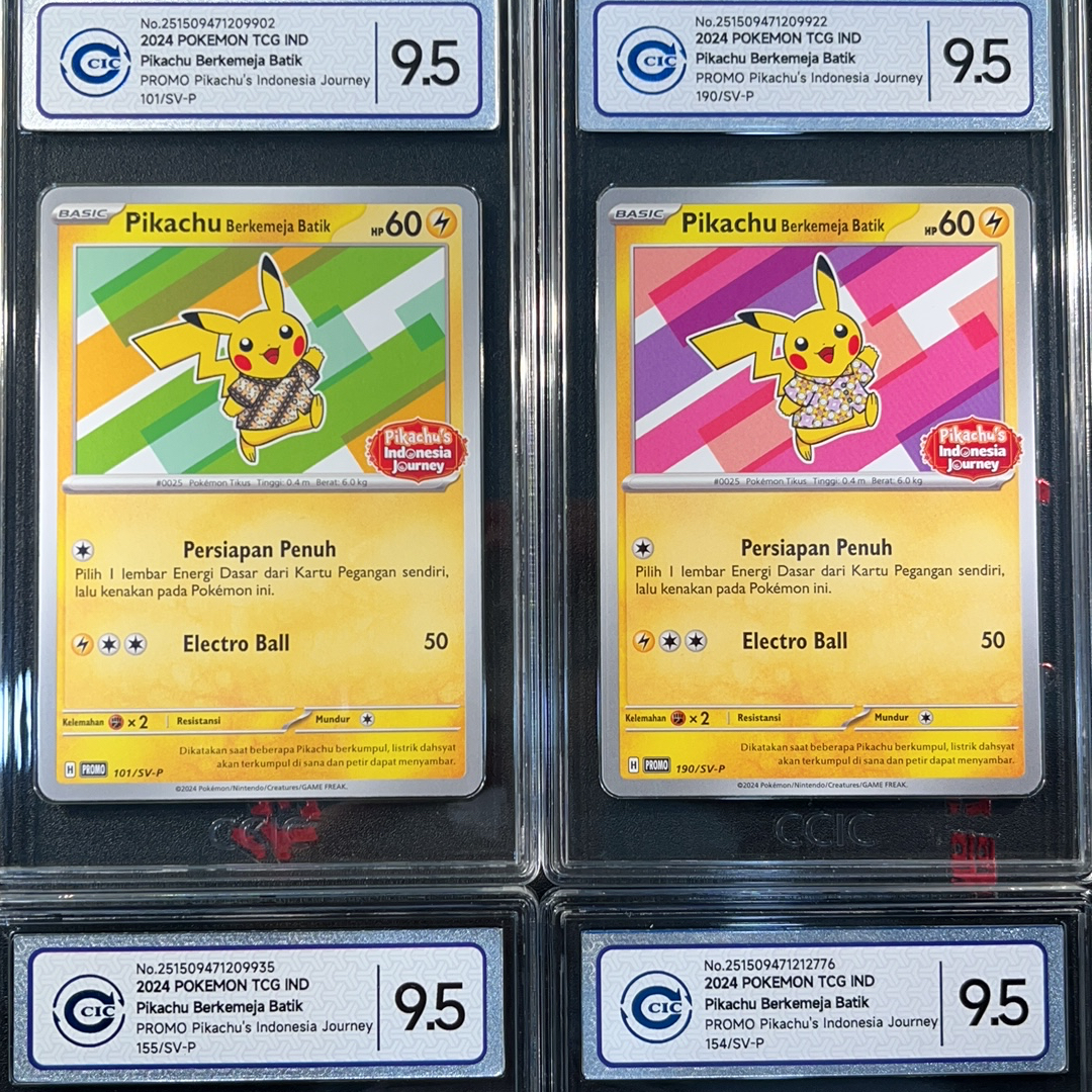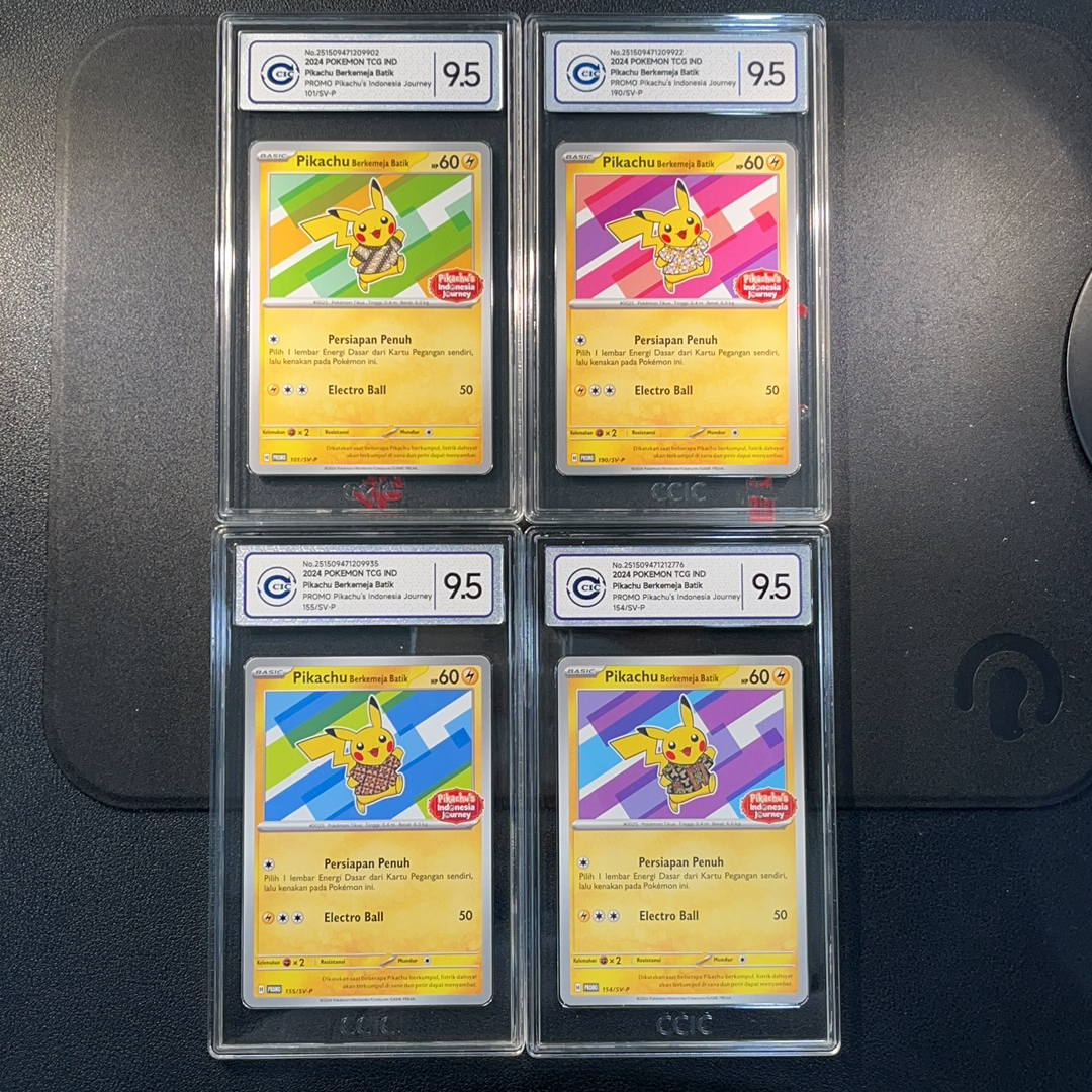 PTCG 宝可梦 非连号 印尼皮卡丘限定卡一套4张 蜡染服饰皮卡丘 101 190 155 154/SV-P 都是CCIC 9.5分 四张一起发 卡品如图【御三家杰哥】967y