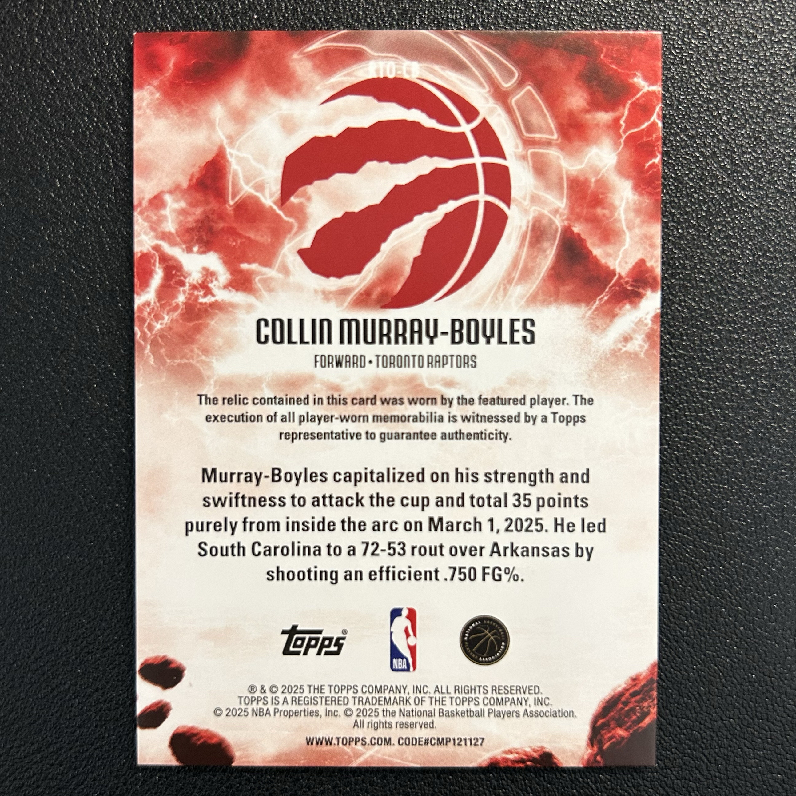 【雷霸龙-拍卖】2025-26 Topps新元年 猛龙 南卡出品 第9顺位 科林-默里-博伊尔斯 亲穿物料 RISE OCCASION 新秀球衣卡RC