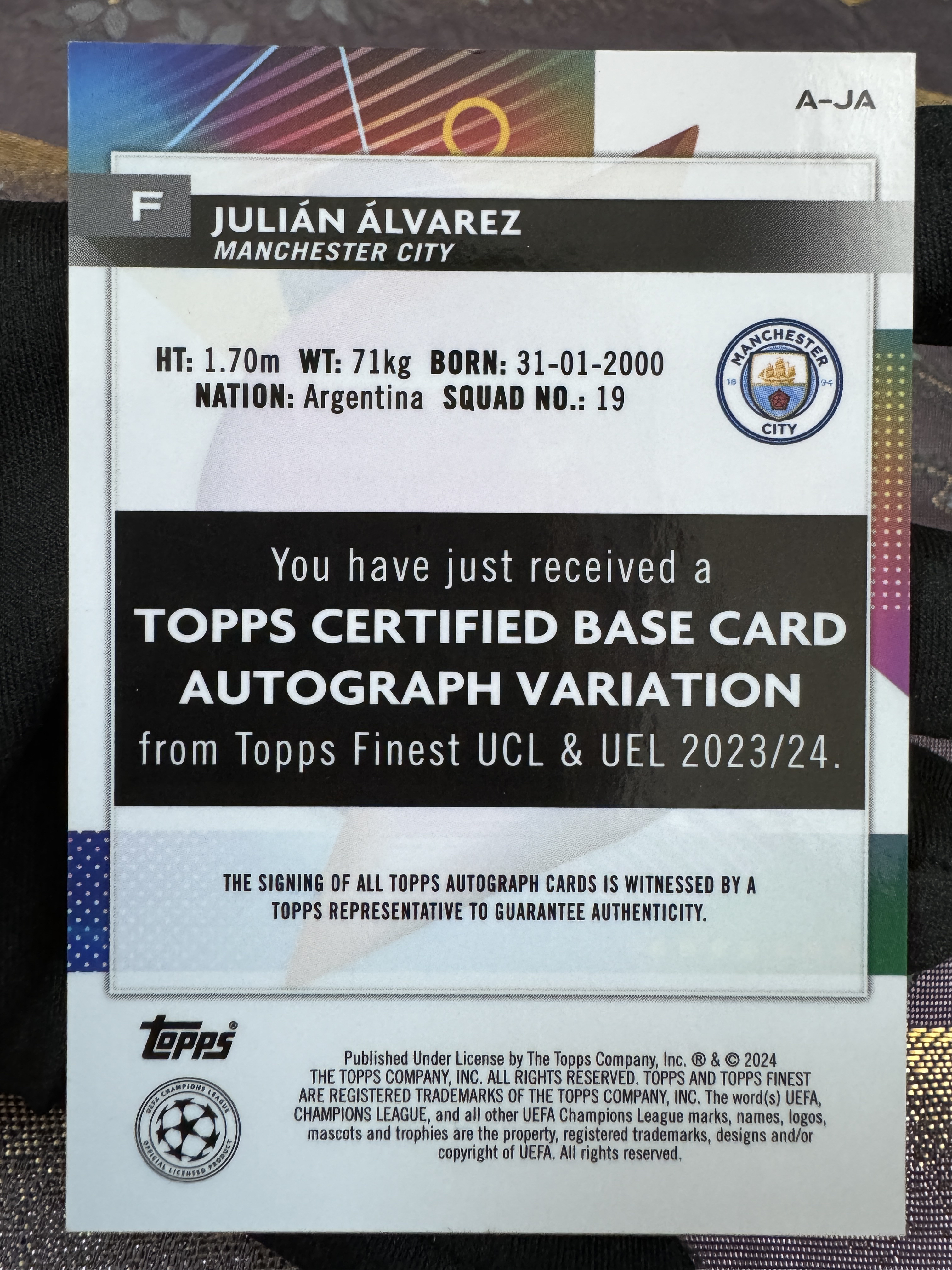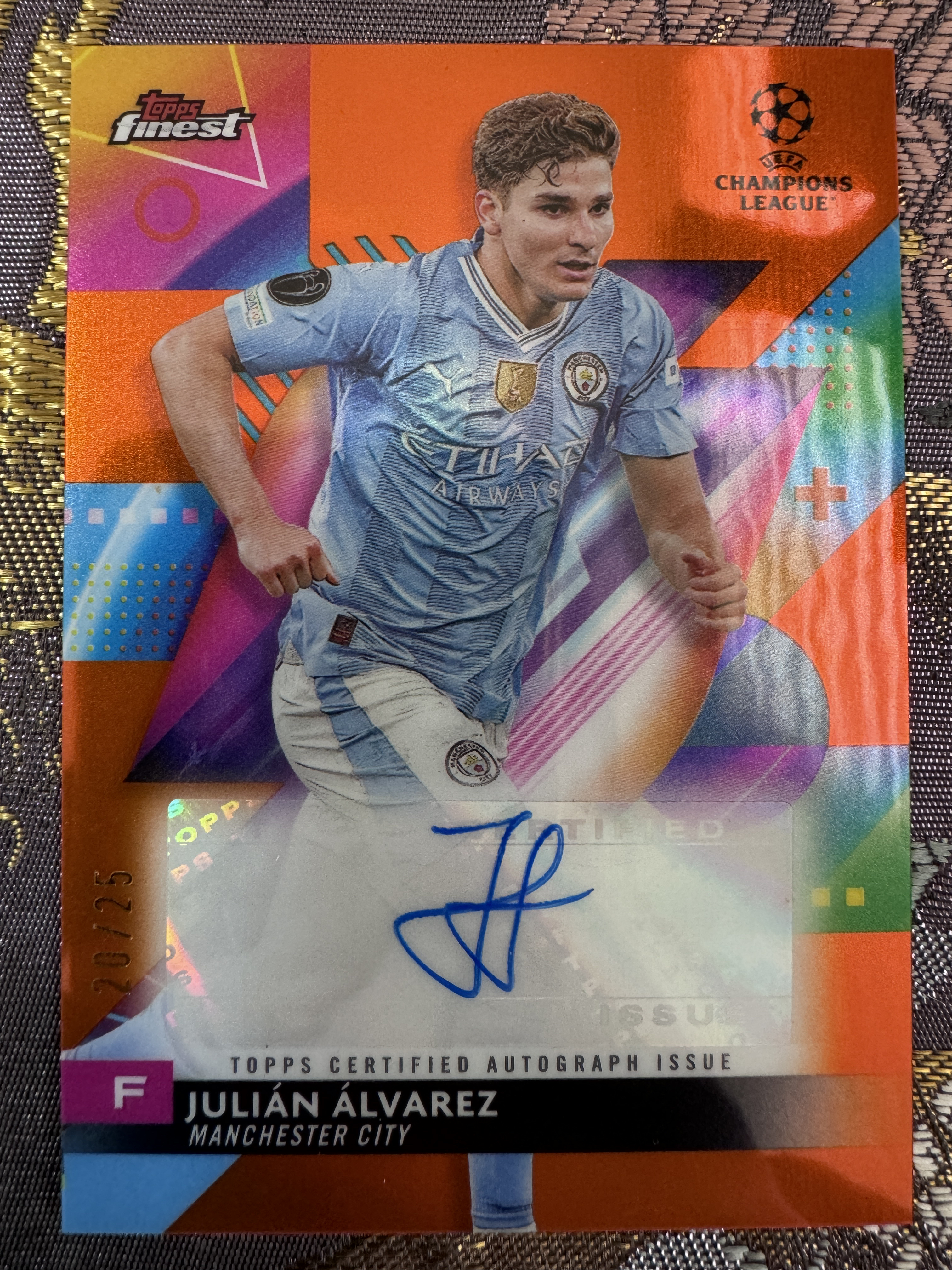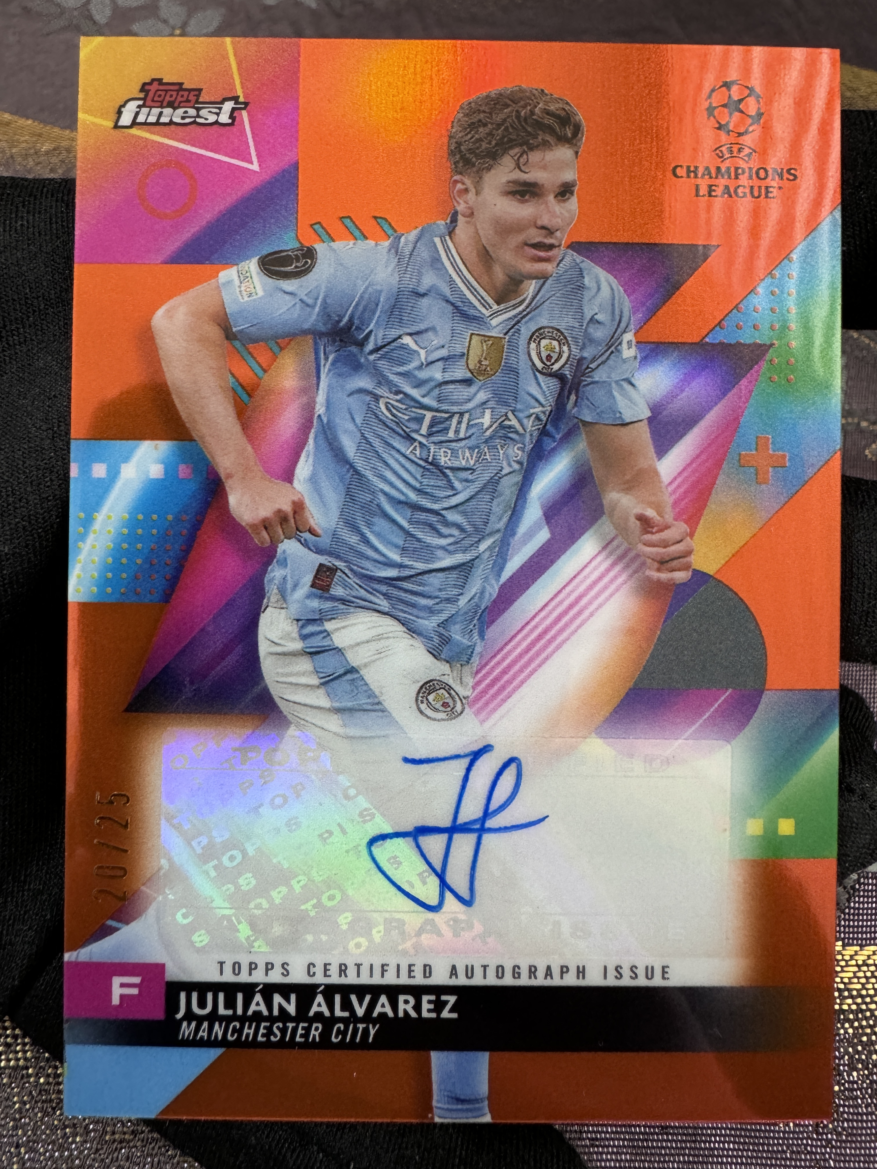 2024 Topps Finest Julián Álvarez 欧冠 finest 曼城 阿根廷 小蜘蛛 阿尔瓦雷斯 世界杯冠军 投资大热 橙折签 20/25编 低编 签字 稀有 完美墨迹 实卡精美