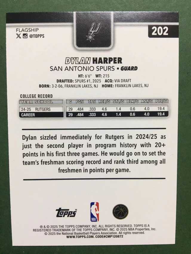 2025 Topps Flagship Dylan Harper RC 元年 新秀 马刺 迪伦 哈珀 银折 折射 正base 文班 卡斯尔同队 潜力无限 弗拉格同届 专收必备 卡品如图#于