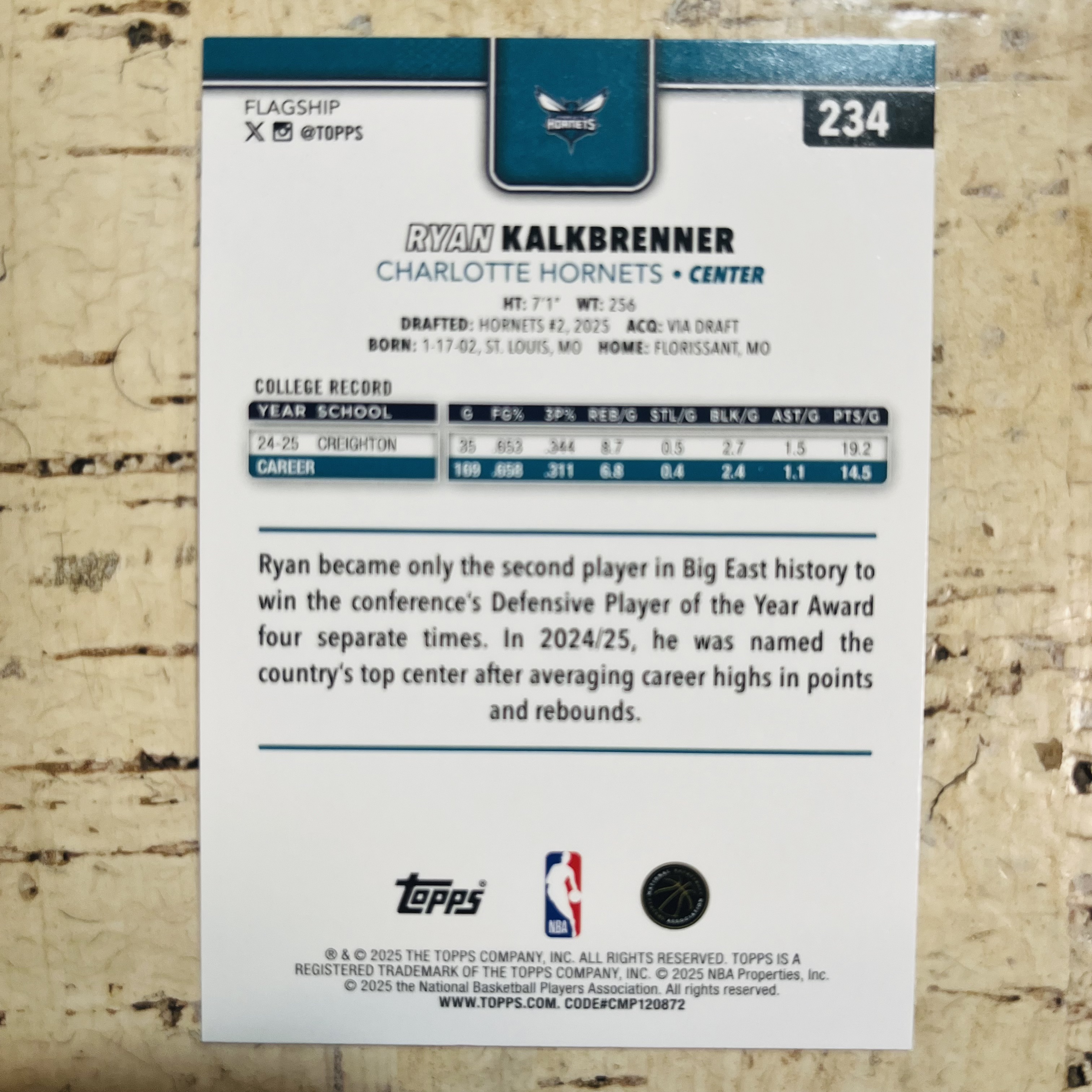 2025-26 Topps Flagship Ryan Kalkbrenner RC 新秀 黄蜂 卡尔克布伦纳 正银折 银折射 holo折 稀有折射 凑彩虹必备【小卡迷拍卖 可累积半年】