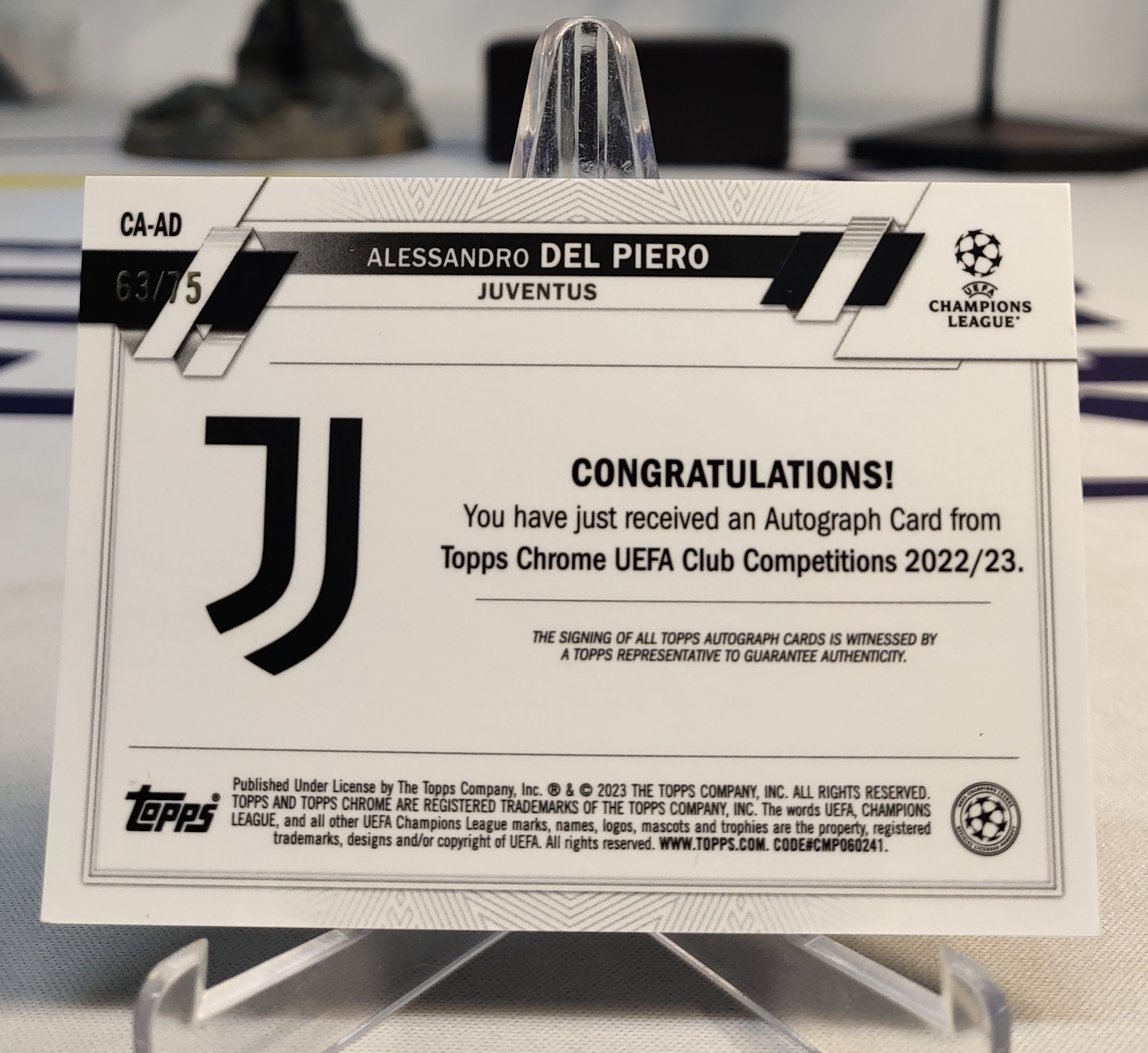 2022-23 Topps Chrome Del Piero 欧冠 TC 德尔 皮耶罗 签字 完美签 63/75编 蓝波纹折 尤文图斯 意大利 传奇 专收收藏必备 品相见图 不累计不到付 cwj