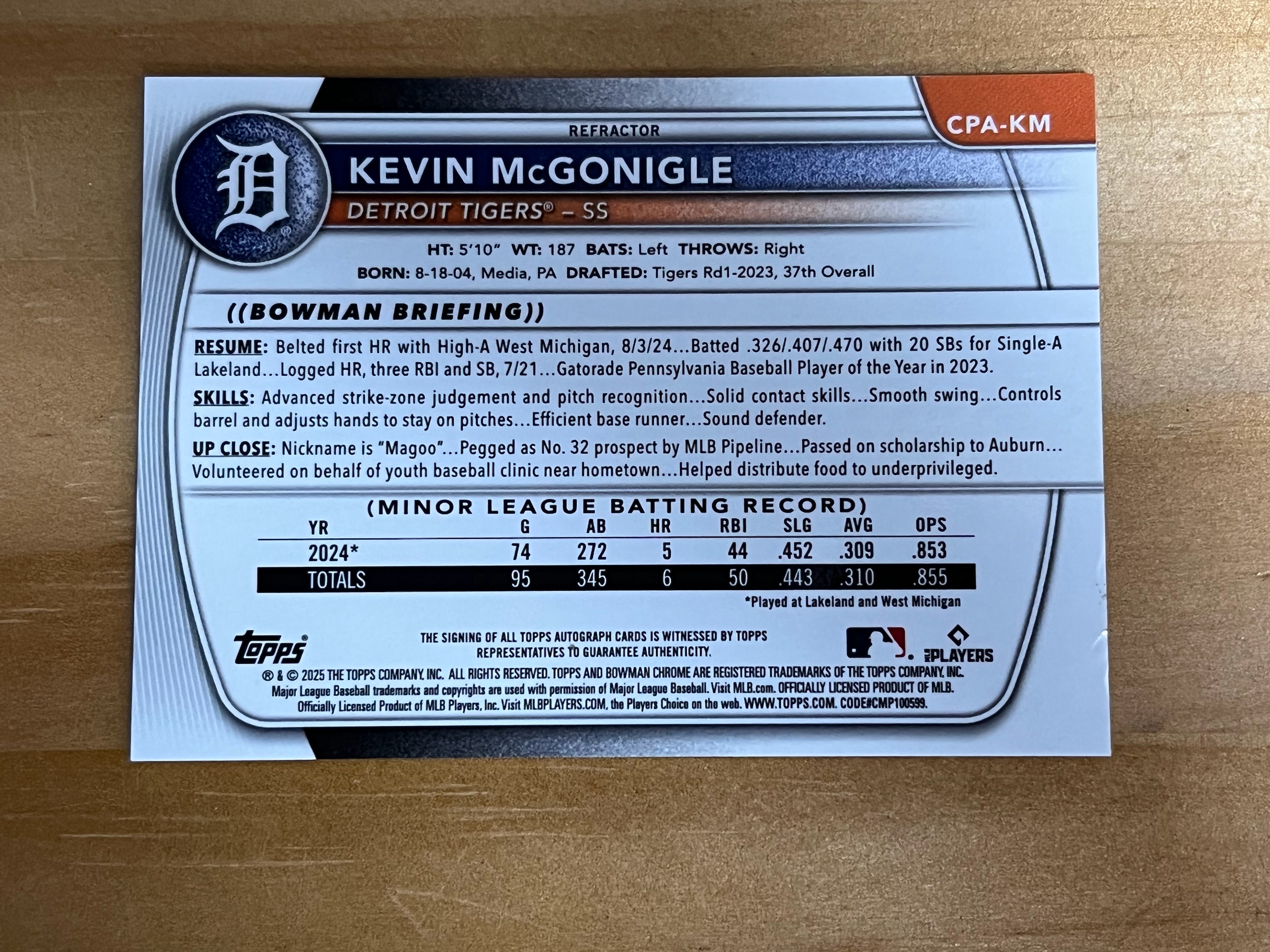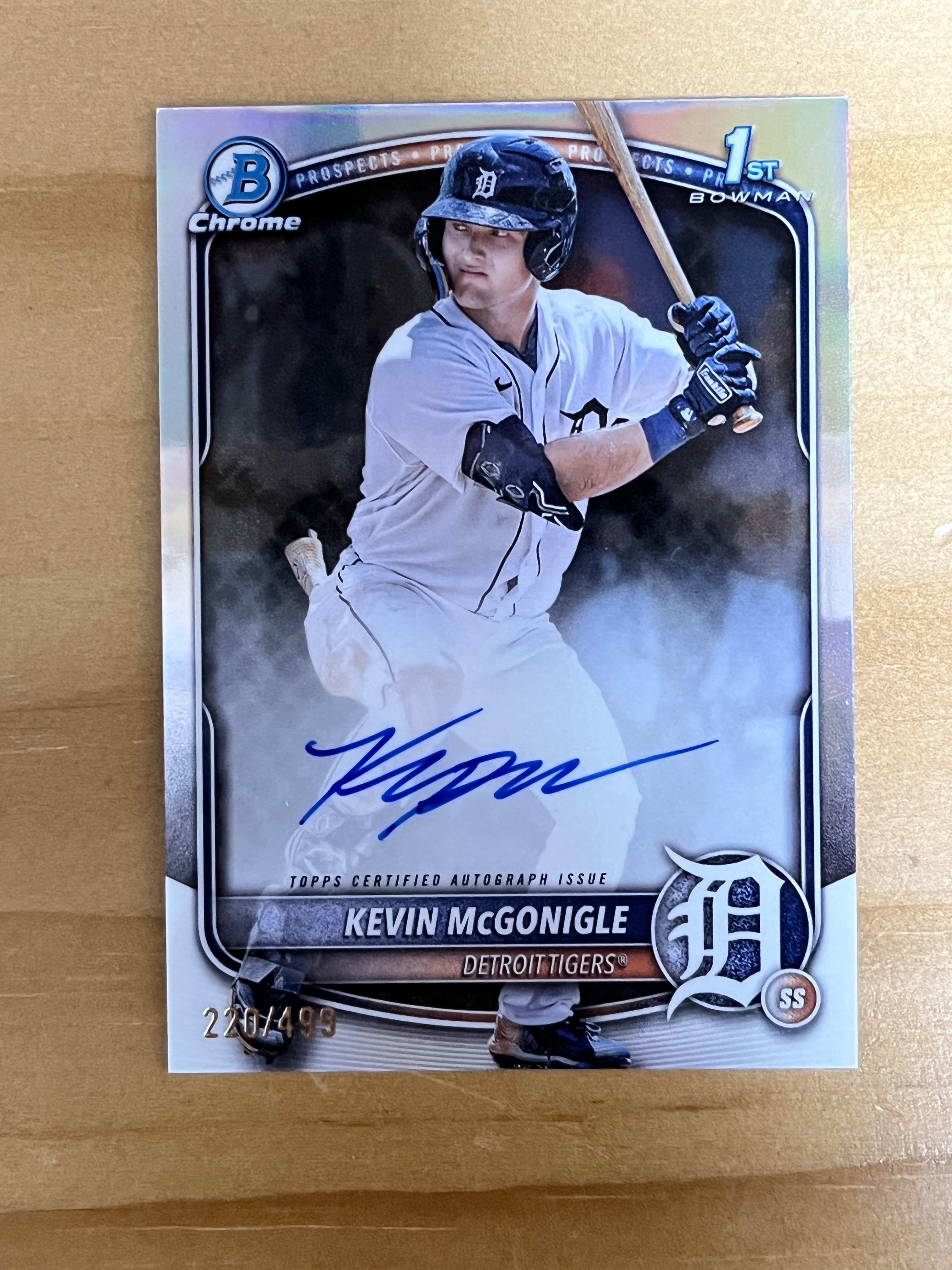 2025 BOWMAN CHROME 底特律老虎 Kevin Mcgonigle 凯文 麦格尼格 新秀 1ST base 银折签字卡 卡签 /499 卡面有小划痕 卡背右边框有瑕疵 花布袋
