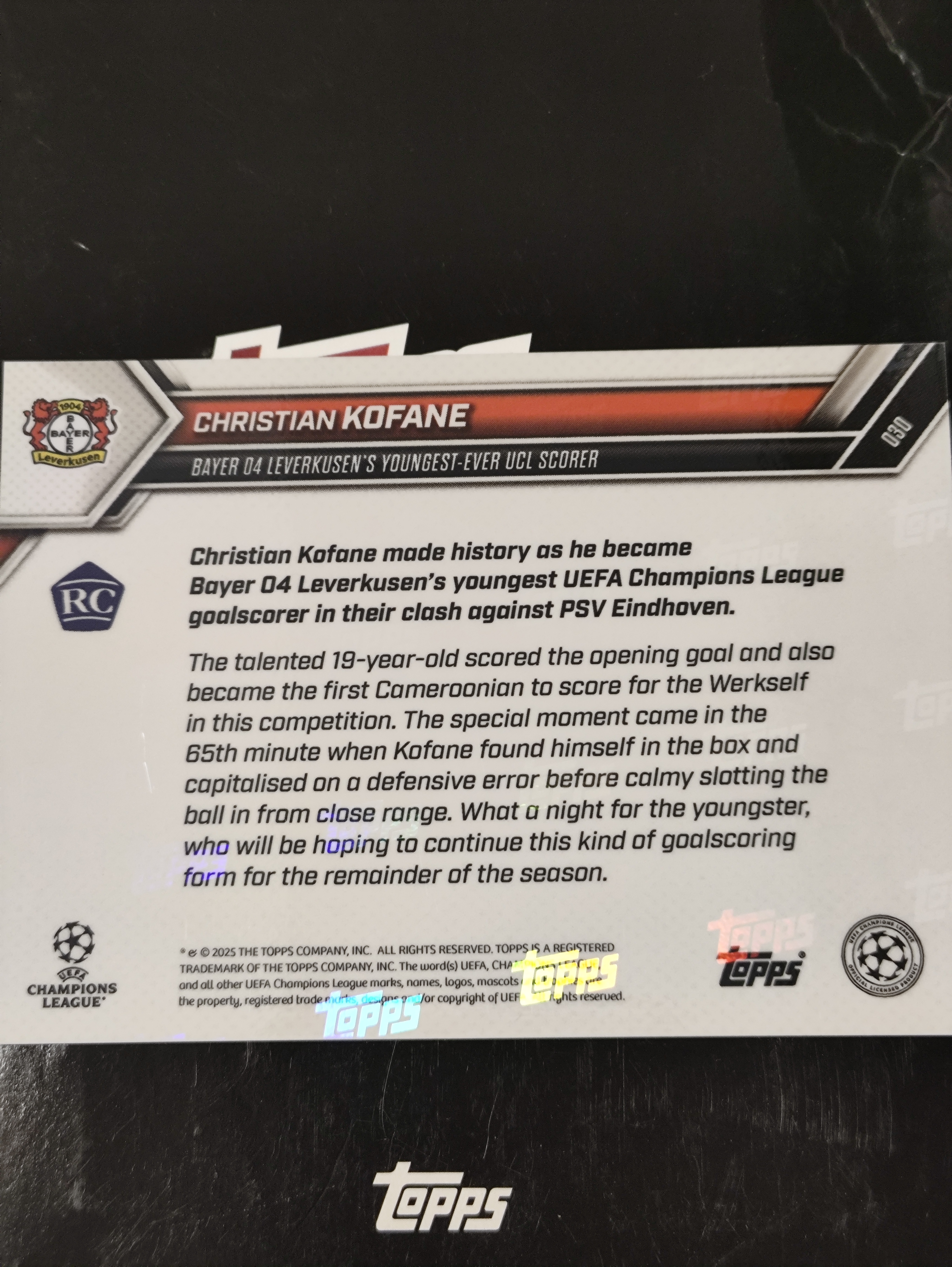 2025 Topps now christian kofane RC 欧冠 德甲 勒沃库森 克里斯蒂安 科法内 喀麦隆 前锋 进球 俱乐部记录