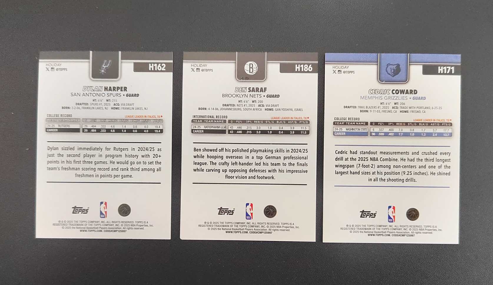 2025-26 Topps holiday Dylan Harper RC 迪伦哈珀 本萨拉夫 塞德里克考沃德 新秀 银磨砂特卡 圣诞节 假日 未来可期 Lot 3张 打包不保卡品