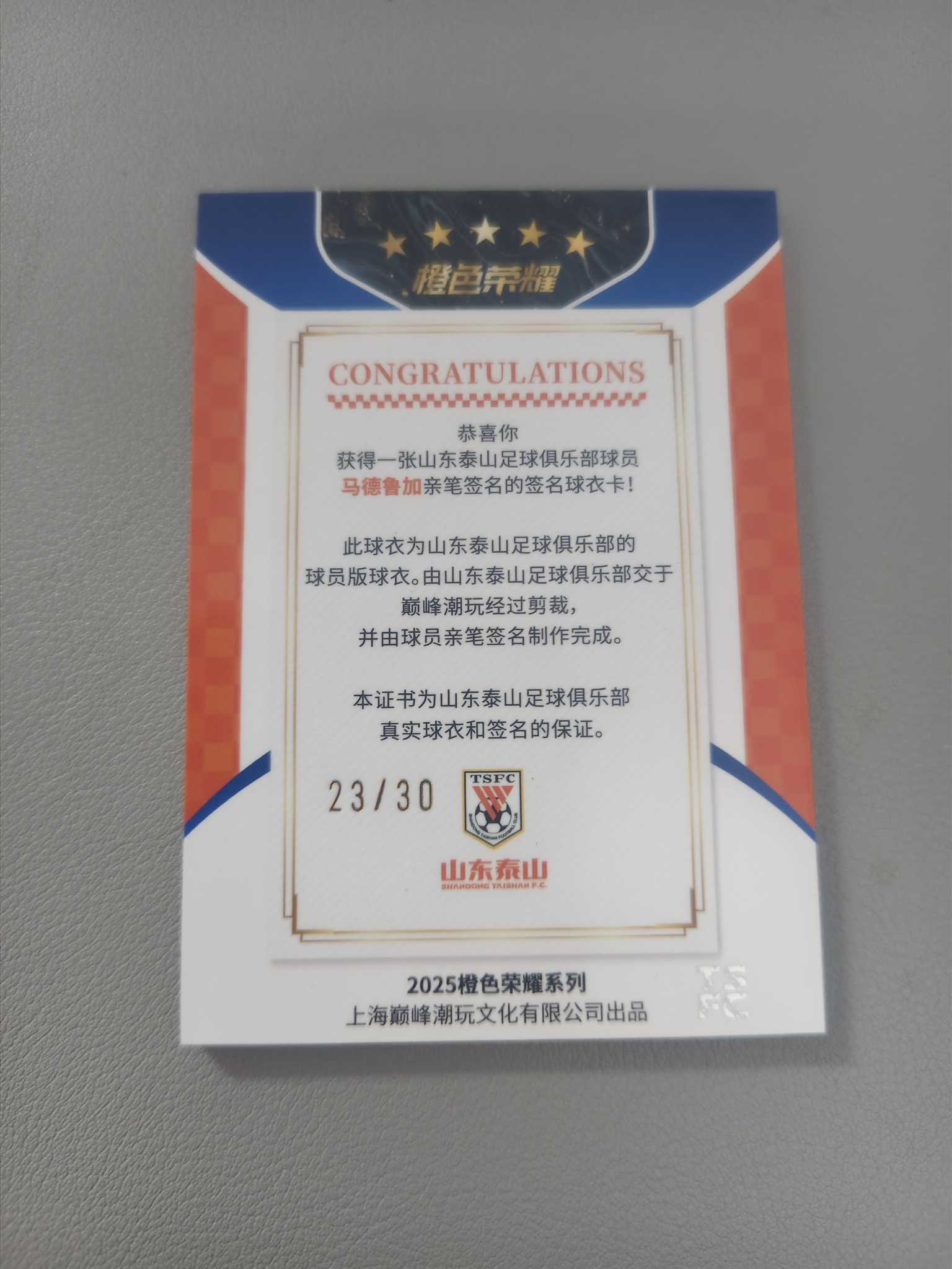 【佩妮拍卖】2025 橙色荣耀系列 上海巅峰潮玩文化有限公司 山东泰山 马德鲁加 亲笔签名 卡签 球衣物料 23/30编 卡品如图 拍前请阅读描述 许哥1204