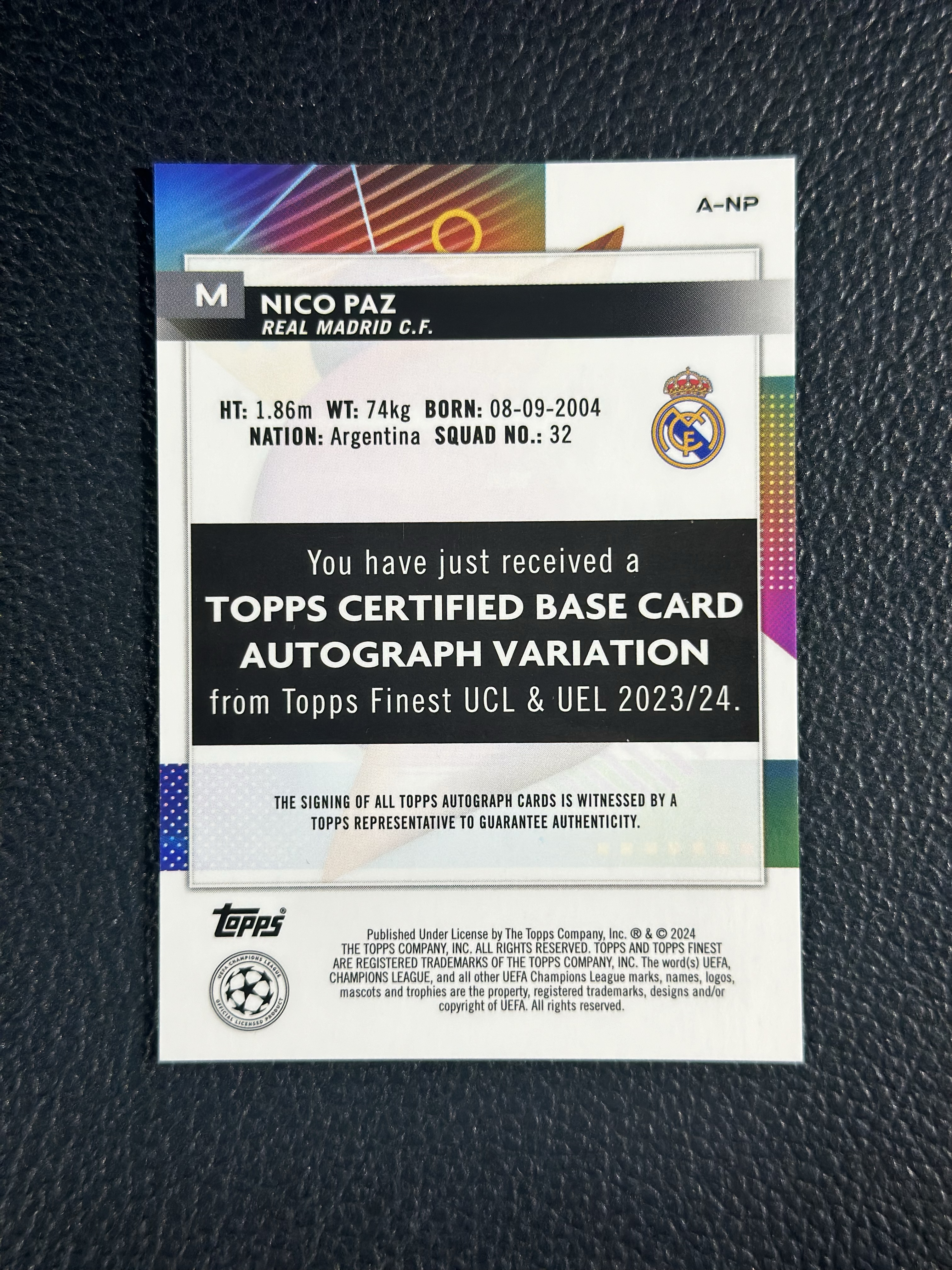 2023-24 Topps Finest Nico paz RC Kacey拍卖欧冠 阿根廷皇马超新星中场 尼科 帕斯 银折完美签字 新秀签 状态爆炸豪门猎物!收藏必备单品如图