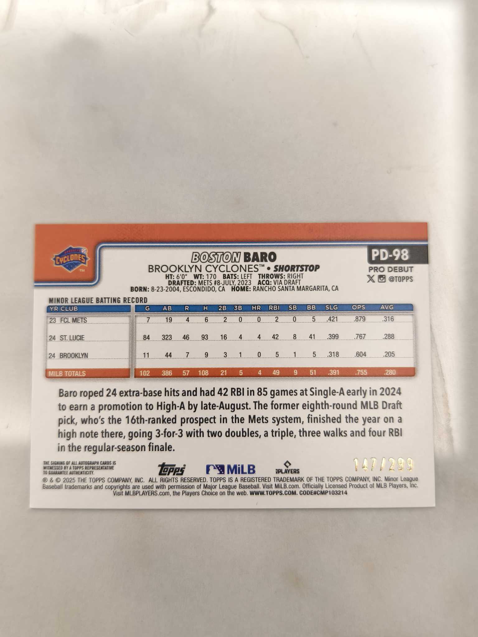 2025 Topps Update Series Boston Baro 波士顿 巴罗 职业首秀 横板签字 紫折 299编 专收必备