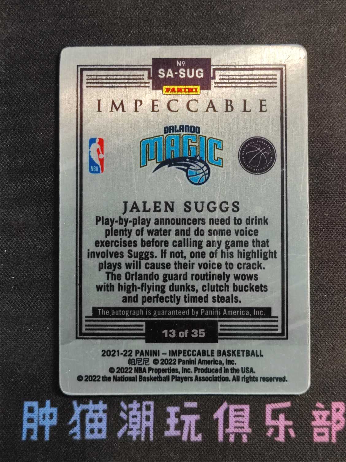 【肿猫球星卡潮玩俱乐部】实体店铺,信誉保障。购买须知:①所有卡的品相为通行品如有重大品相残次问题会在描述中注明。木盒、手提、国宝、IMM、Noir、小真金等等厚卡系列的卡片,有轻微白边白角属于正常品相,折射卡、镜面卡有机械划痕、印刷线属于正常品相,所有卡片不保证后续评级分数。②拍卖卡片不含卡具,自带官方原封砖、原封夹的除外,收到有卡具属于赠送性质,不接受因卡具问题维权,带有原封卡砖、卡夹的卡不保证卡品介意勿拍。③卡片截标后请于3日内通过卡淘线上进行付款,本店保证付款后24小时之内发货,3日内不付款第四日关闭订单,不接受后续协商重开,请免开尊口,本店所有卡片均不支持累计。④签收时请拆封仔细检查卡片品相并录制拆箱视频以便佐证,如果有疑问请于快递签收3日内通过内站内信联系客服,超过3日客服将不予受理。如若遇到快递运输造成卡品损坏与丢失问题,属快递公司的工作失误,本店不予赔偿,但会积极配合买家追诉快递公司的赔偿责任,协助买家将损失降到最低。发货时默认卡淘后台收货人信息,如有其它收货地址,请付款前私信客服提供地址,因地址问题发生纠纷请参考卡淘平台规则。为保证服务质量,本店发货只发顺丰陆运寄付,运费18元,超过首重退运费发顺丰到付,偏远地区(如海南、新疆、西藏、青海、甘肃、内蒙古、云南、广西、宁夏、江西、贵州、港澳台地区)顺丰到付。本店卡淘客服工作时间为:每周一~周五 9:00-17:00,按国家法定节假日公休,由于卡淘工作量巨大,如有怠慢请谅解。更多了解,欢迎加入官方QQ群(天津肿猫球星卡:637855320),店内微信客服(肿猫客服:13001360442)