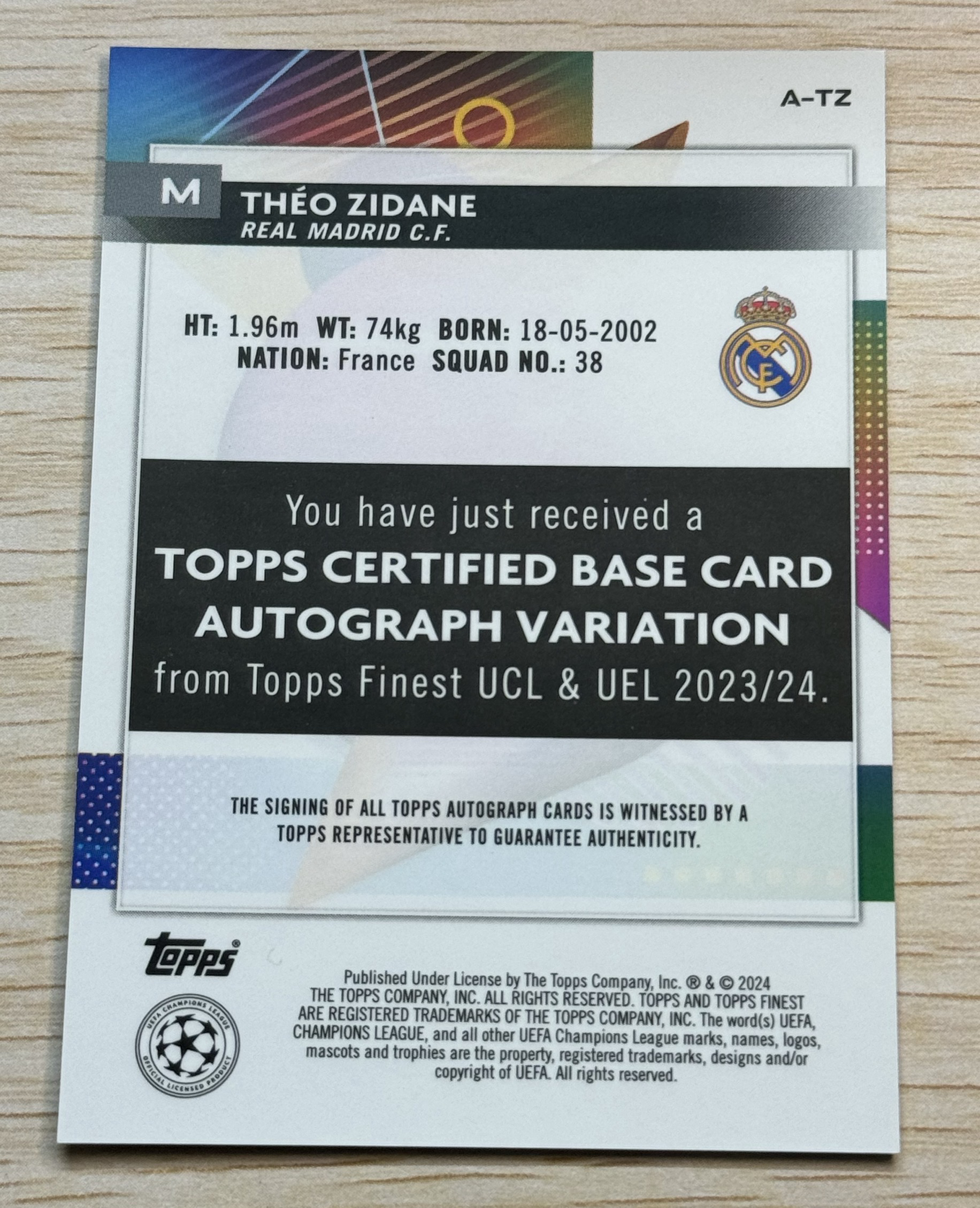 2024 Topps Finest Theo Zidane 欧战finest 特奥 齐达内 新秀 RC 签字 银折 折射 皇马 法国🇫🇷 实卡精美 完美墨迹 凑套必备 不保卡品
