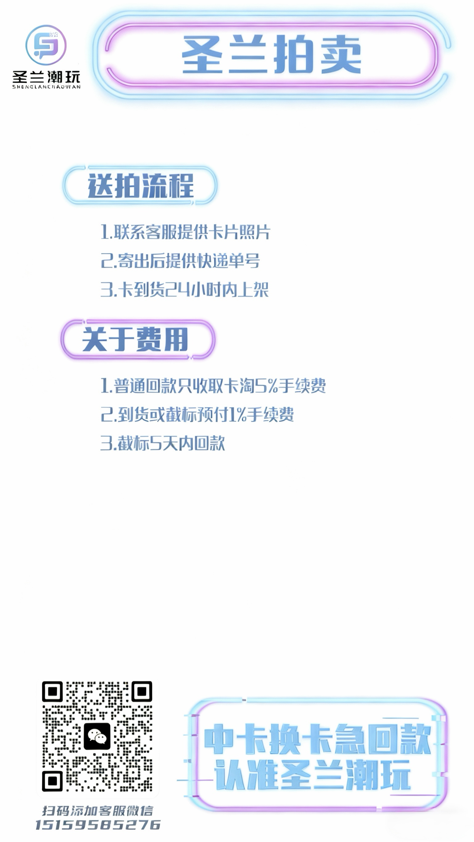 【圣兰拍卖 】如需代卖服务请加V咨询:【15159585276】【Shl250906】免手续费拍卖 急速回款预付60-80%竞拍前请卡友们认真观看以下规则 出价即视为已阅读规则且认同规则:  一、鸽子0容忍!!! 拍后请于3日内付款 3日内不付款将申请投诉封号 不接受任何理由延时付款或重启订单  二、快递发货【不累计!】【不到付!】 付款后72小时内发货 会在规定时间内发货 各位老板无需着急 如需修改地址需先提供【提货码】不提供提货码按默认地址发出本店只发【申通快递 不到付 不累计】 超重另算 介意勿拍 默认无保价服务 高价值卡如需保价请联系站内信或客服【买家拆快递请录制开箱视频】 快递如出现破损、暴力变形、遗失等问题 请自行联系客服理赔 如无开箱视频无法配合维权 售后问题请在订单完成交易之前提出申请 已完成交易订单不再提供售后服务  三、关于卡品 卡品如图 一般通行品以上 如无说明则为通行品 如有瑕疵会提供文字说明 请把图片看清国宝imm等系列厚卡 老卡有白边白角属于正常通行品相 镜面卡签有小划痕属于正常通行品相 出厂印刷线属正常通行品相 评级卡砖上的划痕和破损不属于品相问题 折射系列不保证金标p10 要评级追求金标p10者请直接购买金标p10特殊卡种如折射、镜面卡、聚光灯很难有非常完美的卡品 如您追求品相完美请直接购买评级卡【多卡打包lot不保卡品】  四、关于合并订单 所有截标商品 次日合并订单 若有多个已合并订单 请站内或者客服留言修改运费如果遇到重复收取运费 已收运费却发到付等运费问题 站内或客服留言会处理返还所有订单拍完后一起付款 先付款的会先发货  五、关于交换版 交换版只邮寄 不发码  站内信客服时间:【中午12:00-晚上11:00】 微信客服时间:【中午12:00-晚上11:00】