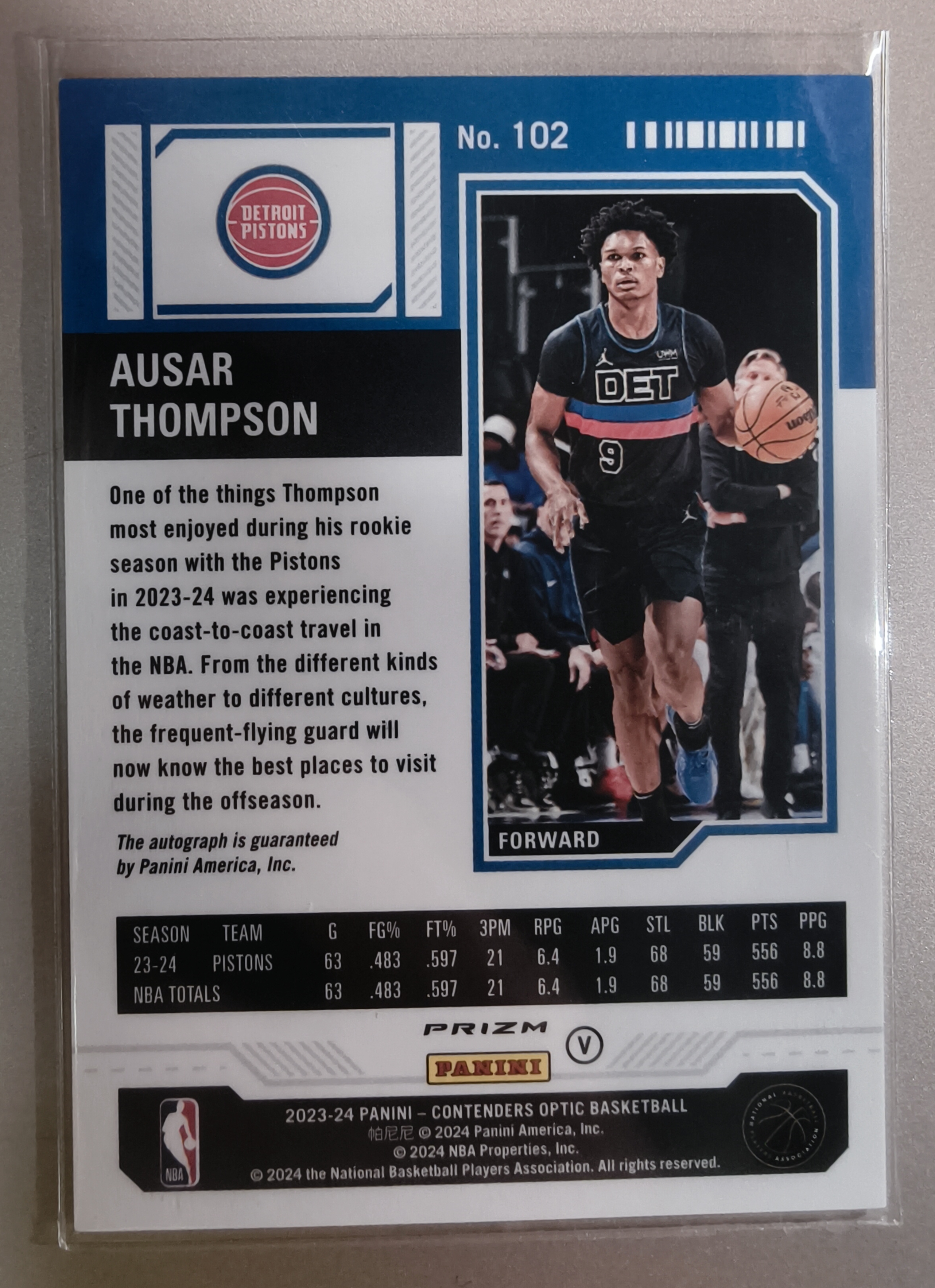 2023-24 Panini Contenders Optic Ausar Thompson RC 奥萨 汤普森 活塞 球票卡签新秀 折射 卡品极好签字墨迹清晰完美如图