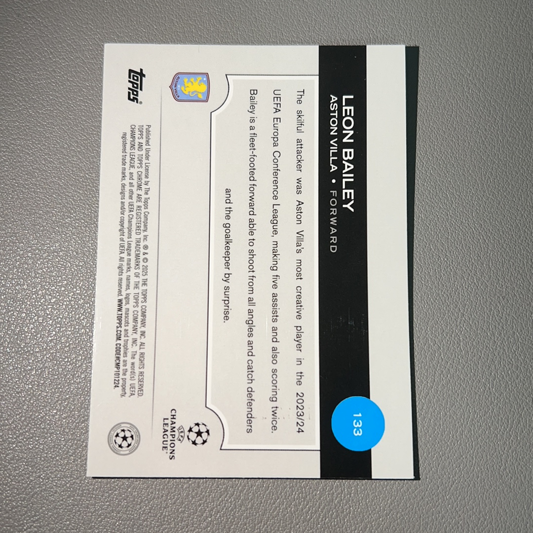 2025 Topps Chrome Leon Bailey 欧冠 tc 利昂 贝利 拜利 牙买加 阿斯顿维拉 罗马 199编 青折 折射 Base 卡品如图