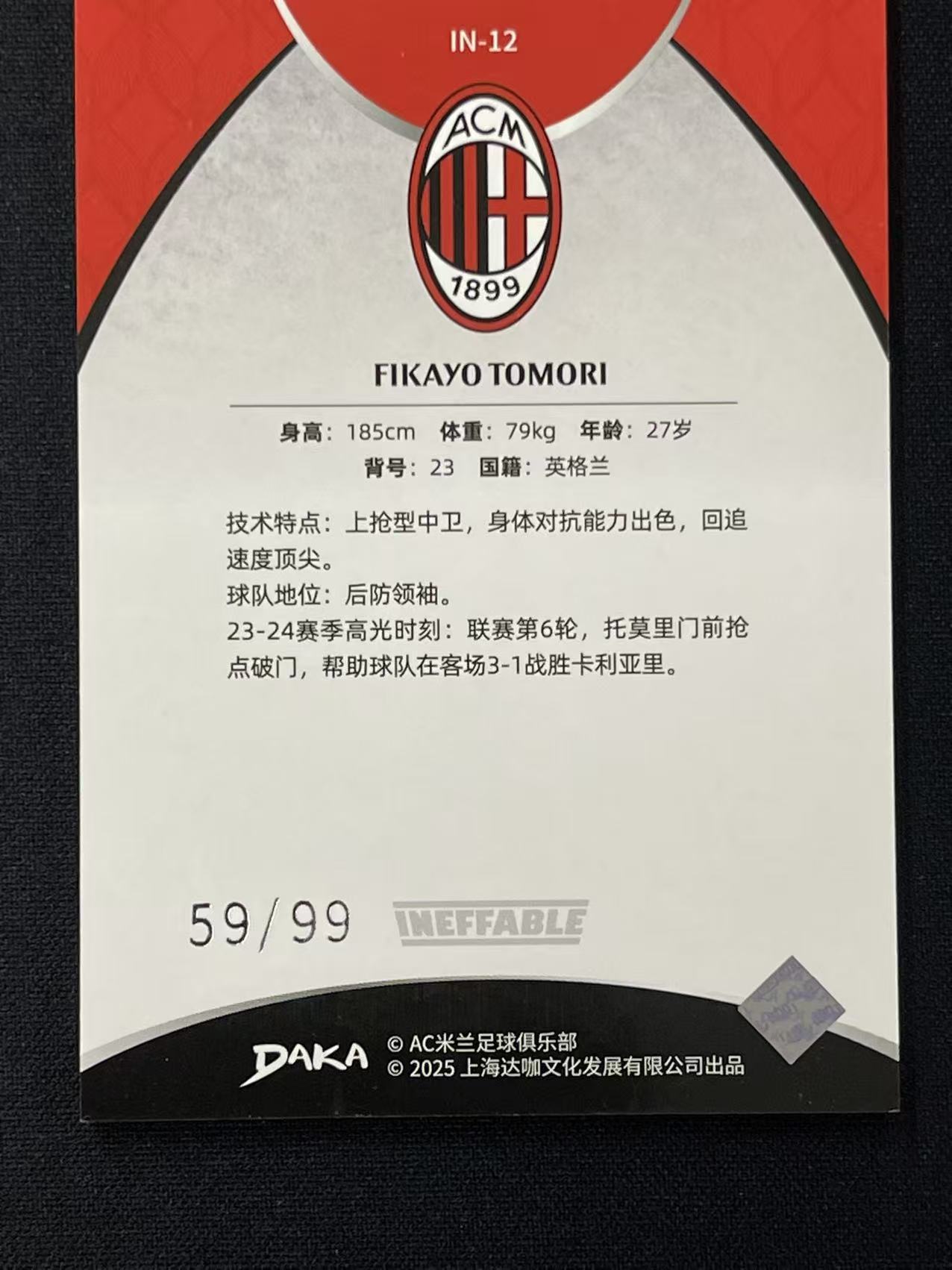 2025 DAKA 2024-25 DAKA AC Milan Fikayo Tomori 托莫里 英格兰 Ineffable 厚卡Base 59/99编 银平行 IN-12 贝勒28