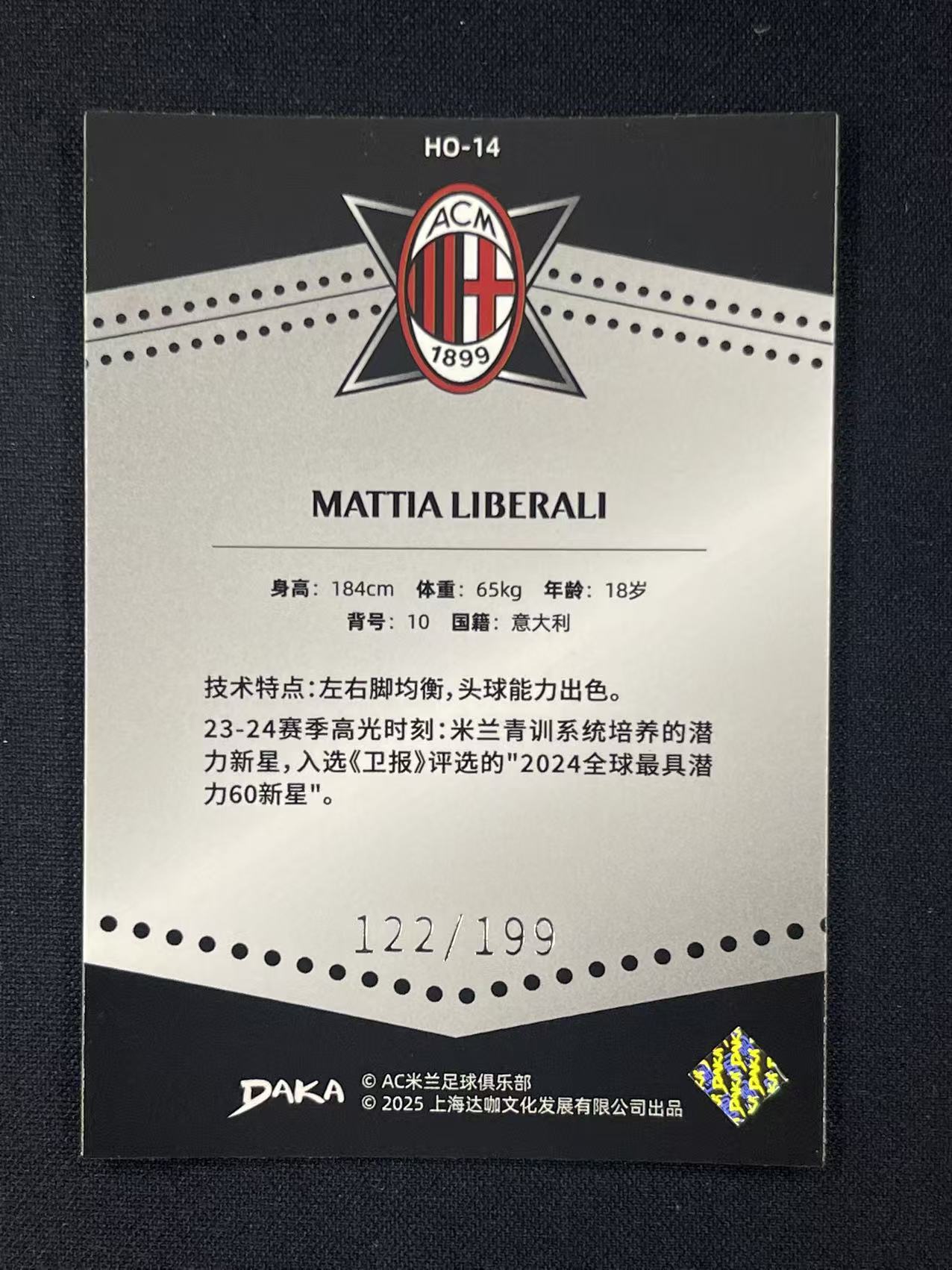 2024-25 DAKA AC米兰 MilanOne&Two队盒 Mattia Liberali 利贝拉里 Holocene Base 122/199编 银平行 HO-14 卡品如图 贝勒28
