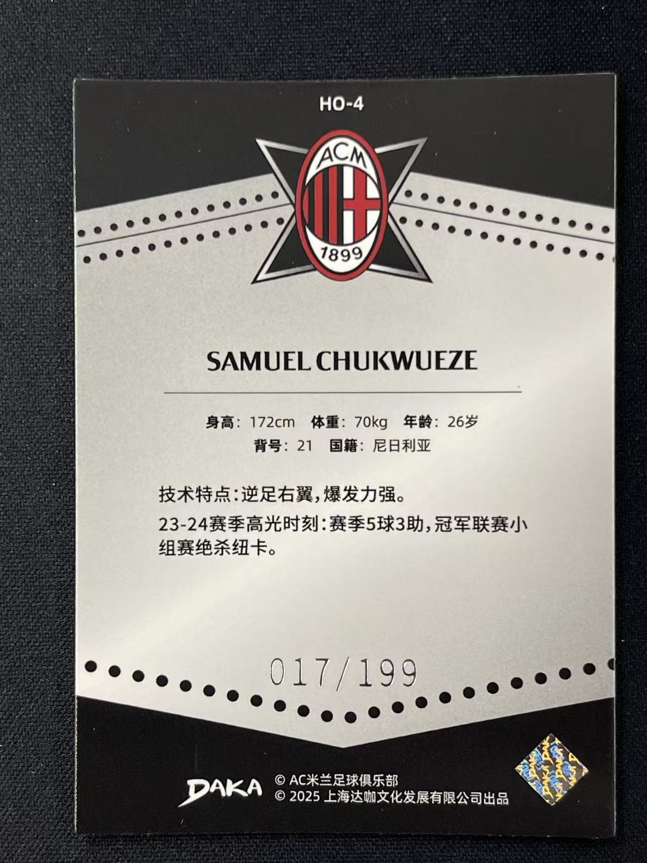 2024-25 DAKA AC米兰 MilanOne&Two队盒 Samuel Chukwueze 丘库埃泽 Holocene Base 017/199编 银平行 HO-4