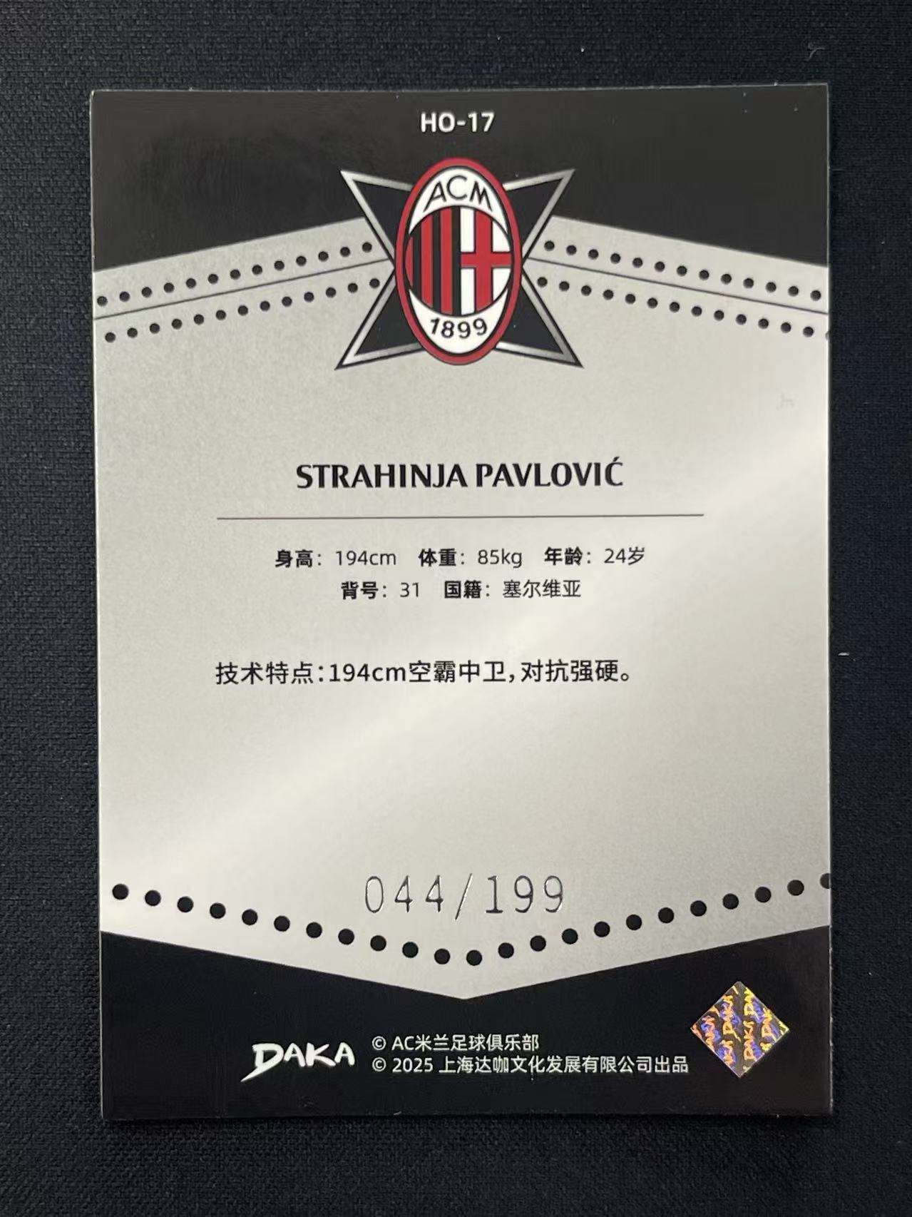 2024-25 DAKA AC米兰 MilanOne&Two队盒 Strahinja Pavlovic 帕夫洛维奇 Holocene Base 044/199编 银平行 HO-17 卡品如图 凑套必备