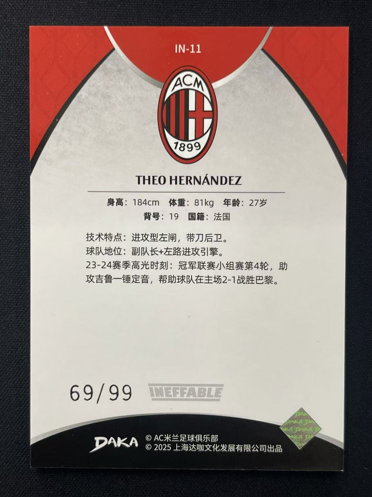 2024-25 DAKA AC米兰 MilanOne&Two队盒 Theo Hernández 特奥 法国 Ineffable 厚卡Base 69/99编 银平行 IN-11 卡品如图 凑套必备