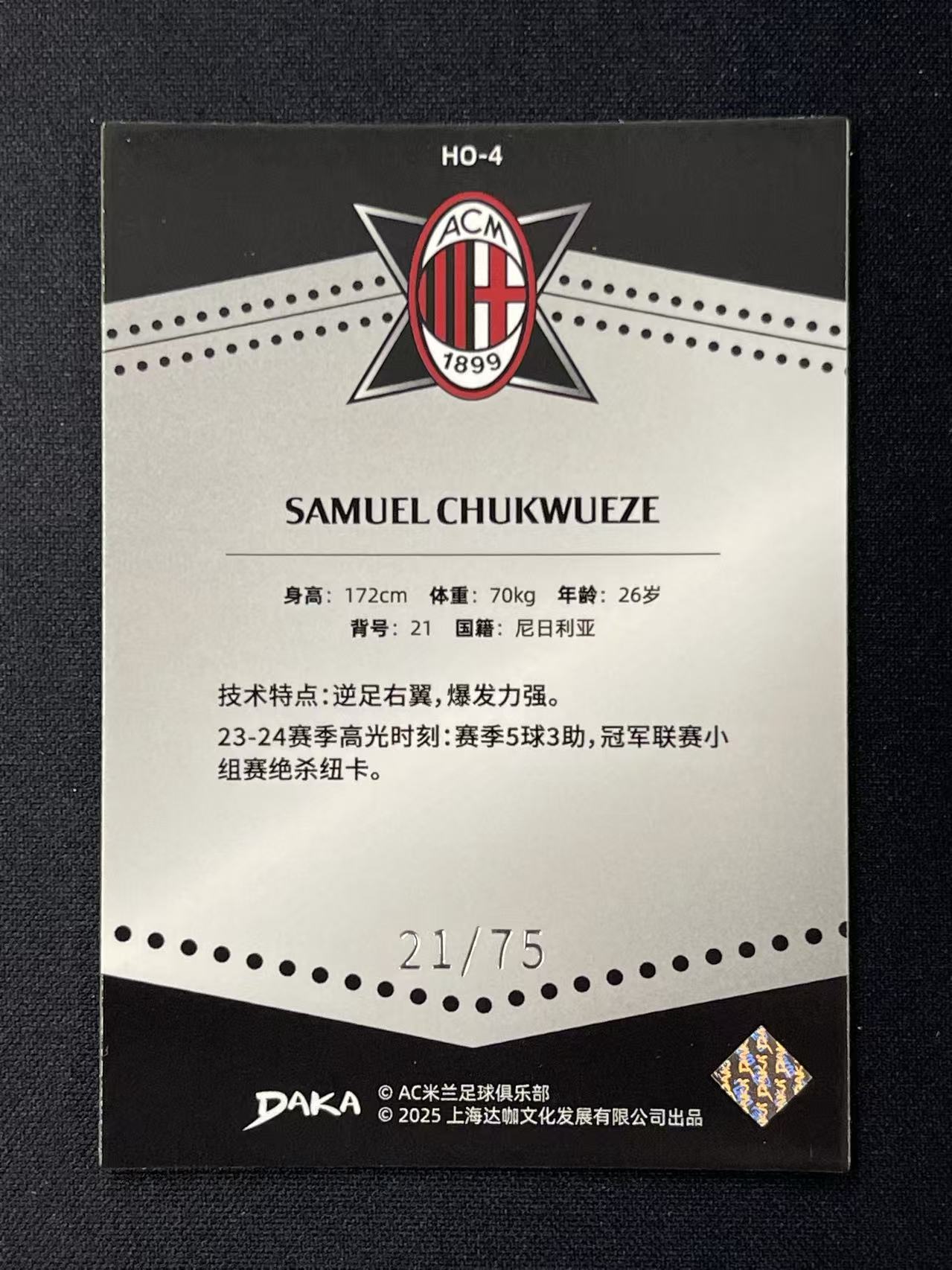 2024-25 DAKA AC米兰 MilanOne&Two队盒 Samuel Chukwueze 丘库埃泽 Holocene Base 21/75编 同背号 橙平行 HO-4