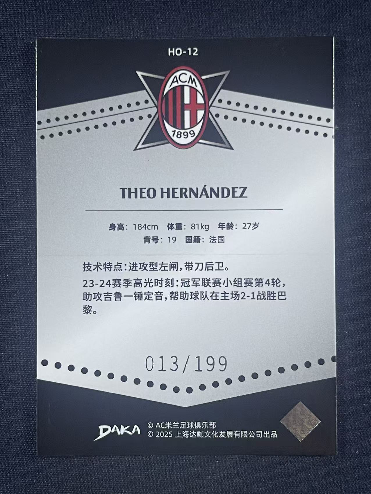 2024-25 DAKA AC米兰 MilanOne&Two队盒 Theo Hernández 特奥 法国 Holocene Base 013/199编 银平行 HO-12 卡品如图 凑套必备