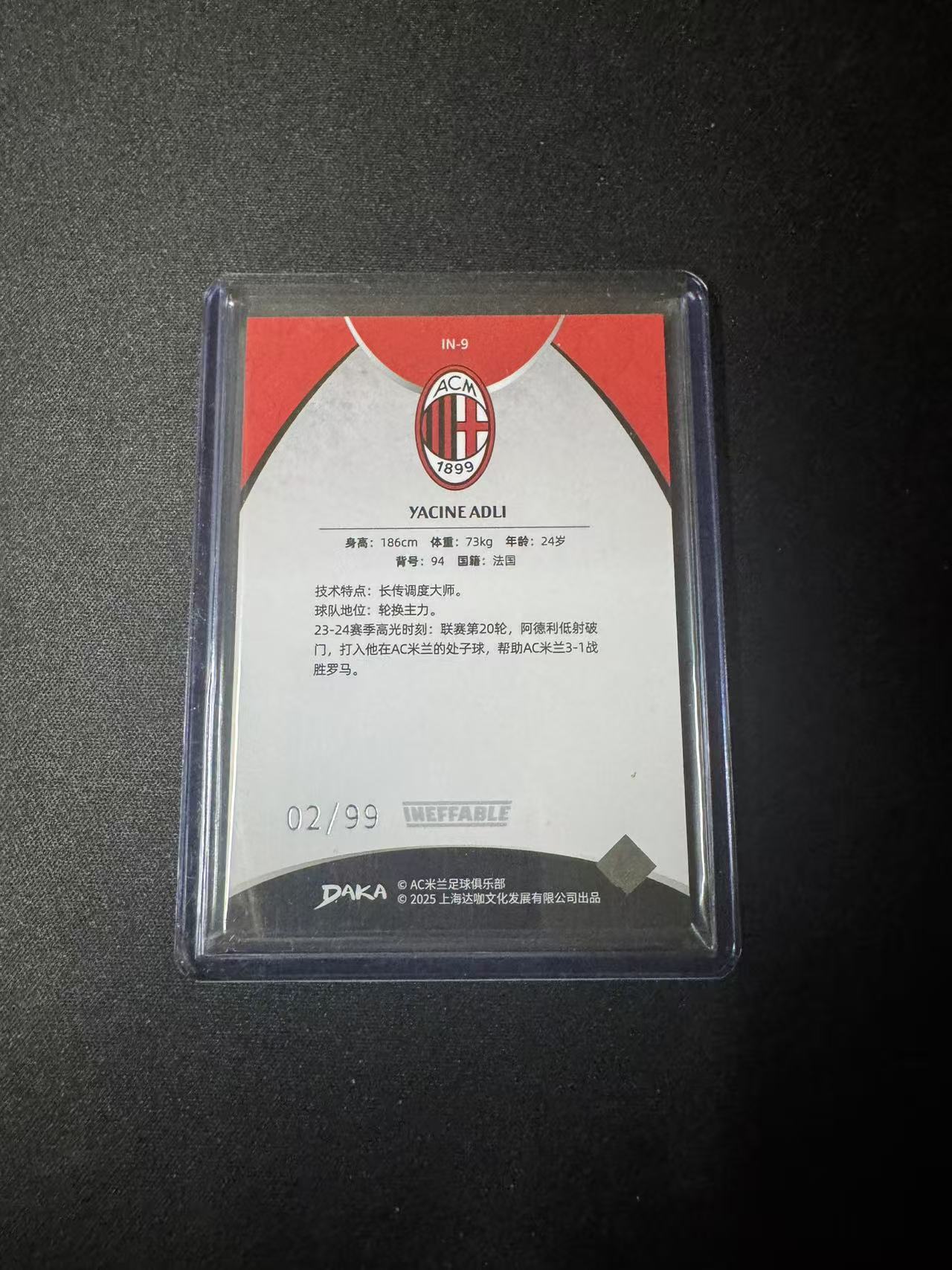 2024-25 DAKA AC米兰 MilanOne&Two队盒 Yacine Adli 阿德利 Ineffable 厚卡Base 02/99编 银平行 IN-9 卡品如图 凑套必备 招财猫