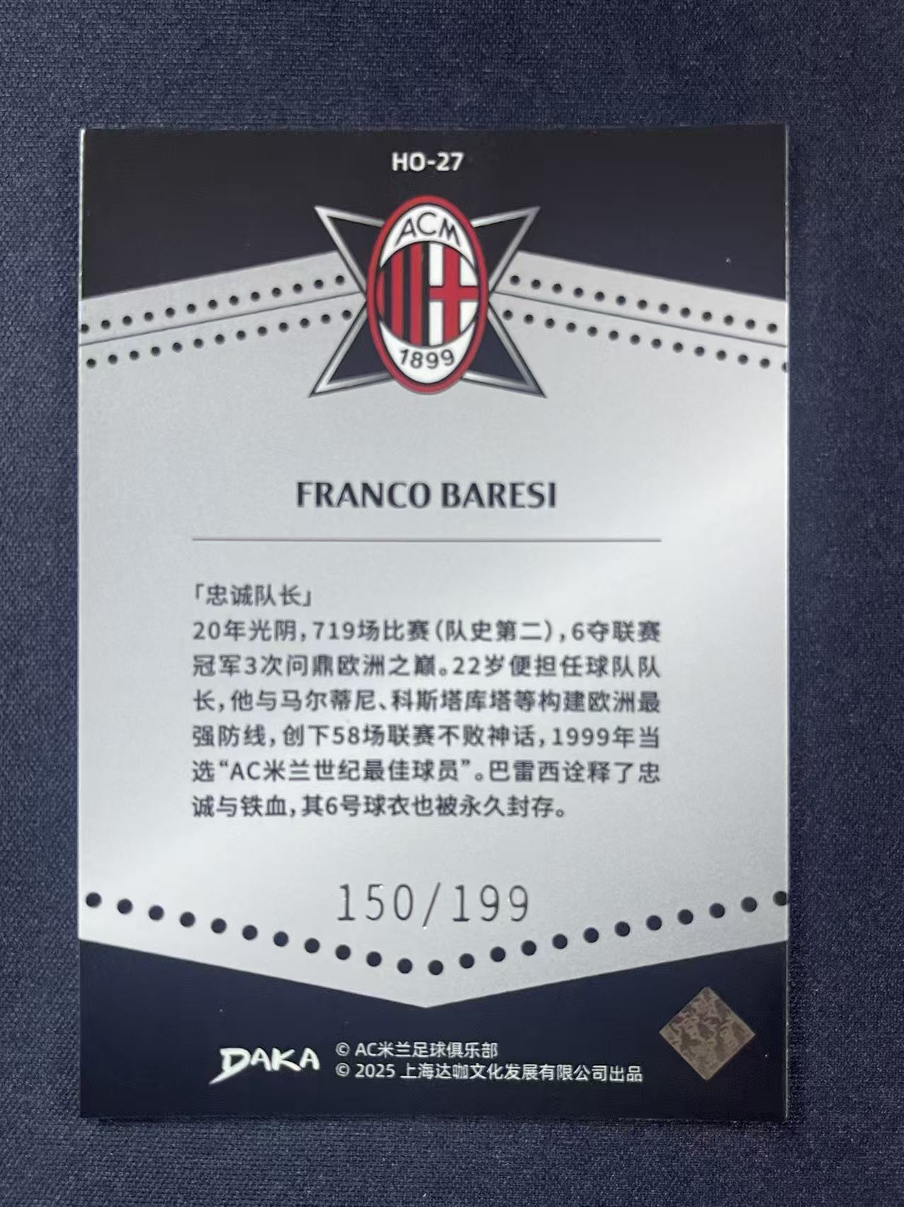 2024-25 DAKA AC米兰 MilanOne&Two队盒 Franco Baresi 巴雷西 铁血队长 一生一队 HOLOCENE Base 150/199编 银平行 HO-27