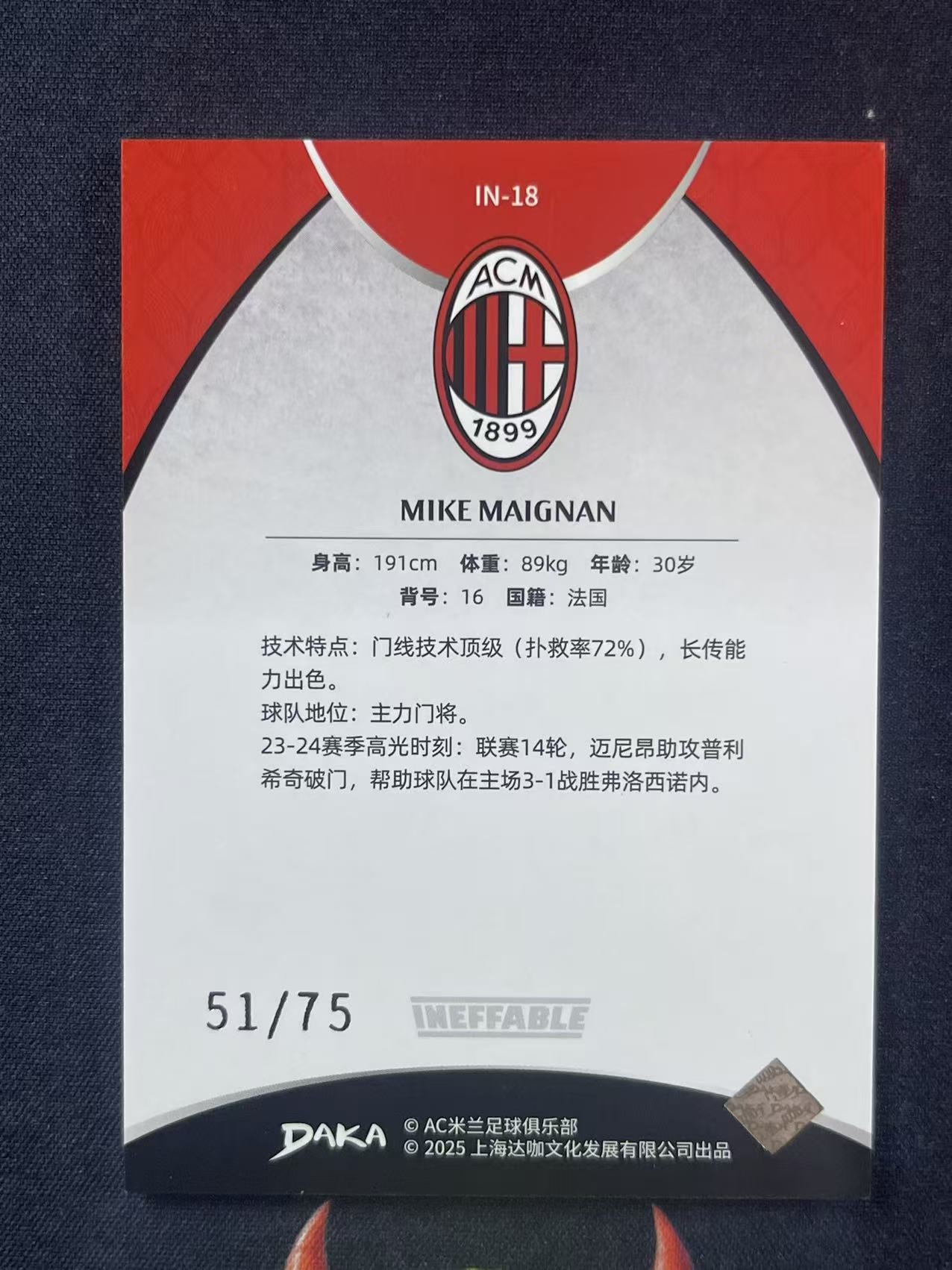 2024-25 DAKA AC米兰 MilanOne&Two队盒 Mike Maignan 迈尼昂 法国门神 Ineffable 厚卡Base 51/75编 紫平行 IN-18