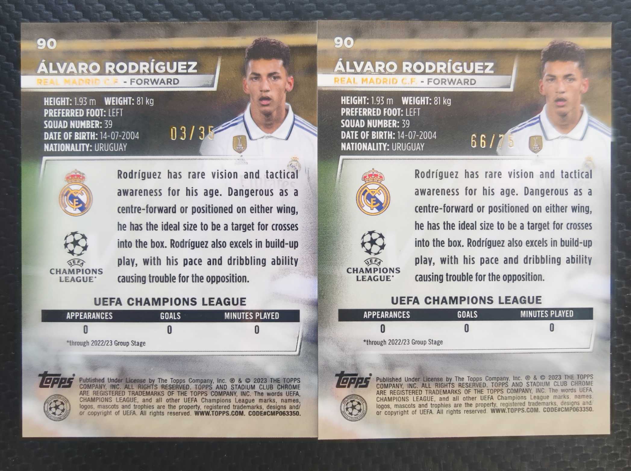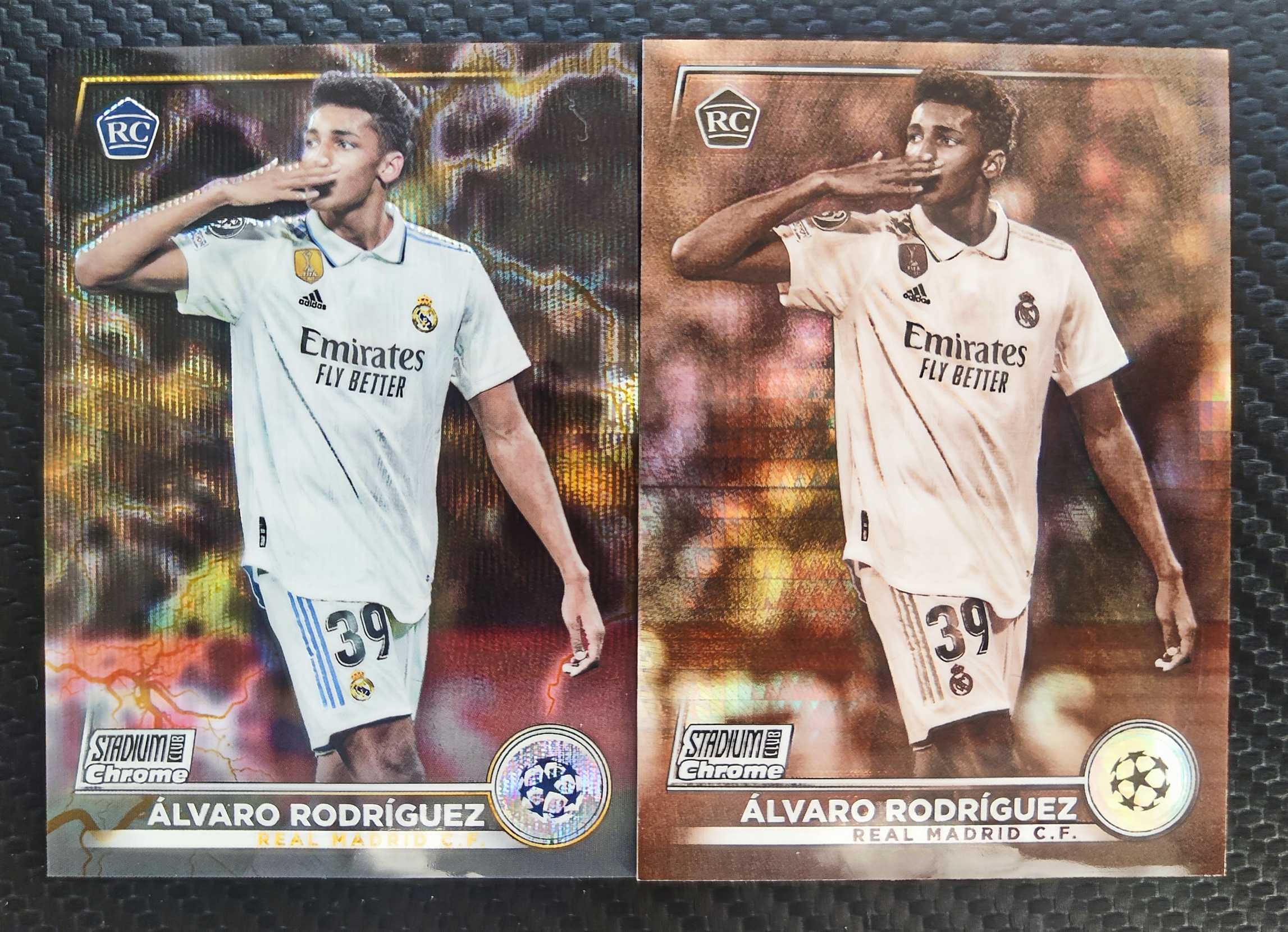 2023 Topps Stadium Club Chrome Alvaro Rodriguez RC 欧冠 竞技场 皇马 新秀 罗德里格斯 35编 黑 金 闪电 2张 lot 打包 卡品见图 阅读描述