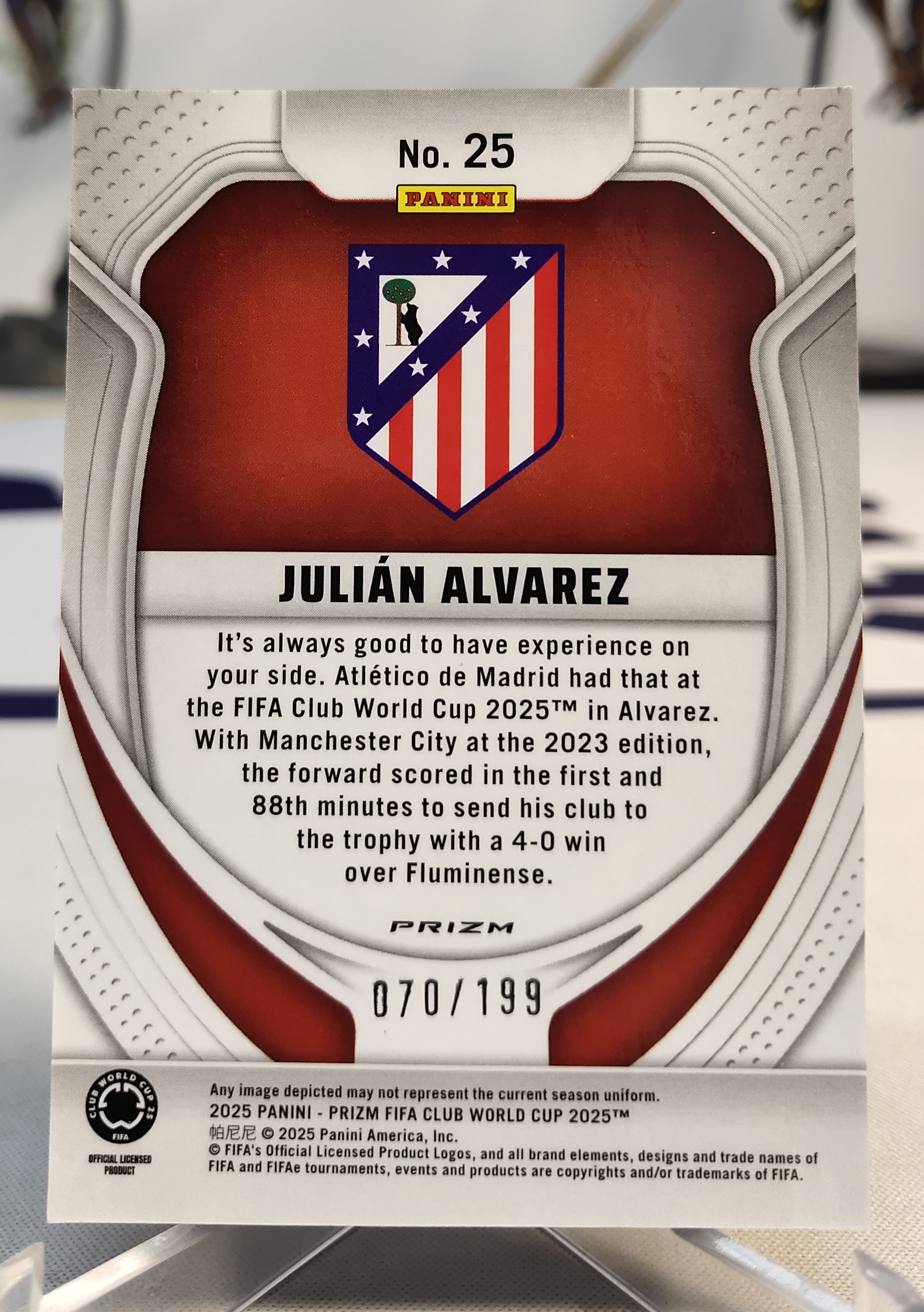 2025 Panini Prizm Julián Álvarez 元年 世俱杯 PZ 胡利安 阿尔瓦雷斯 小蜘蛛 70/199编 红折 阿根廷 马德里竞技 专收收藏必备 品相见图 不累计不到付 cwj