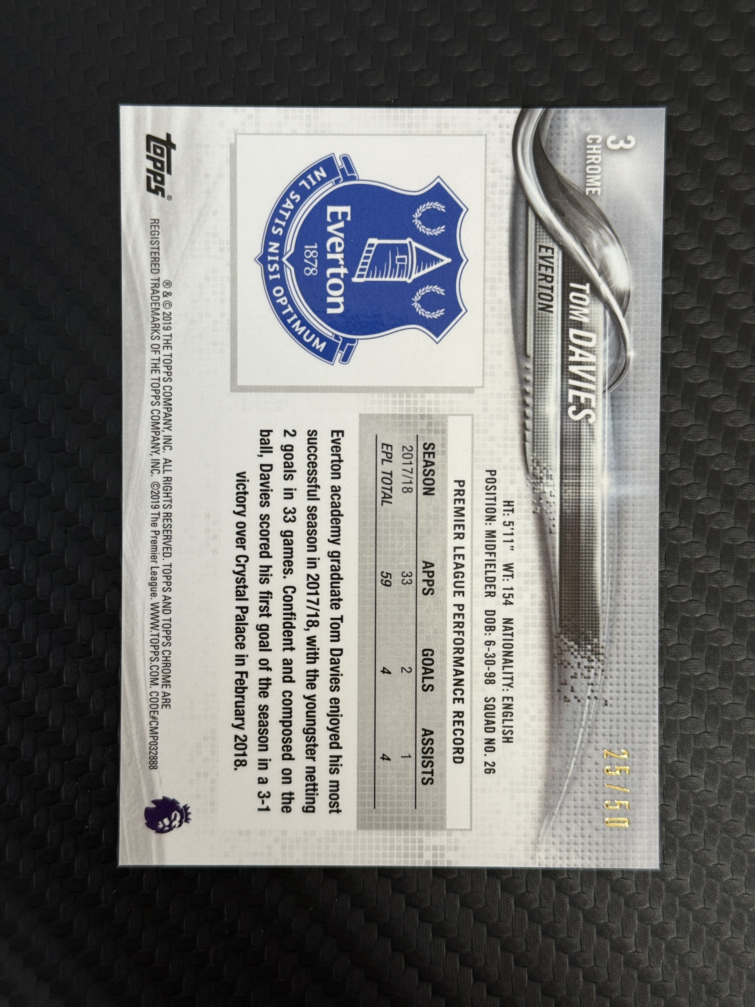 2018-19 Topps Premier Tom Davies 【包来拍卖】英超tc 元年 埃弗顿 汤姆 戴维斯 正金折 折射 50编 卡品如图 番茄飞