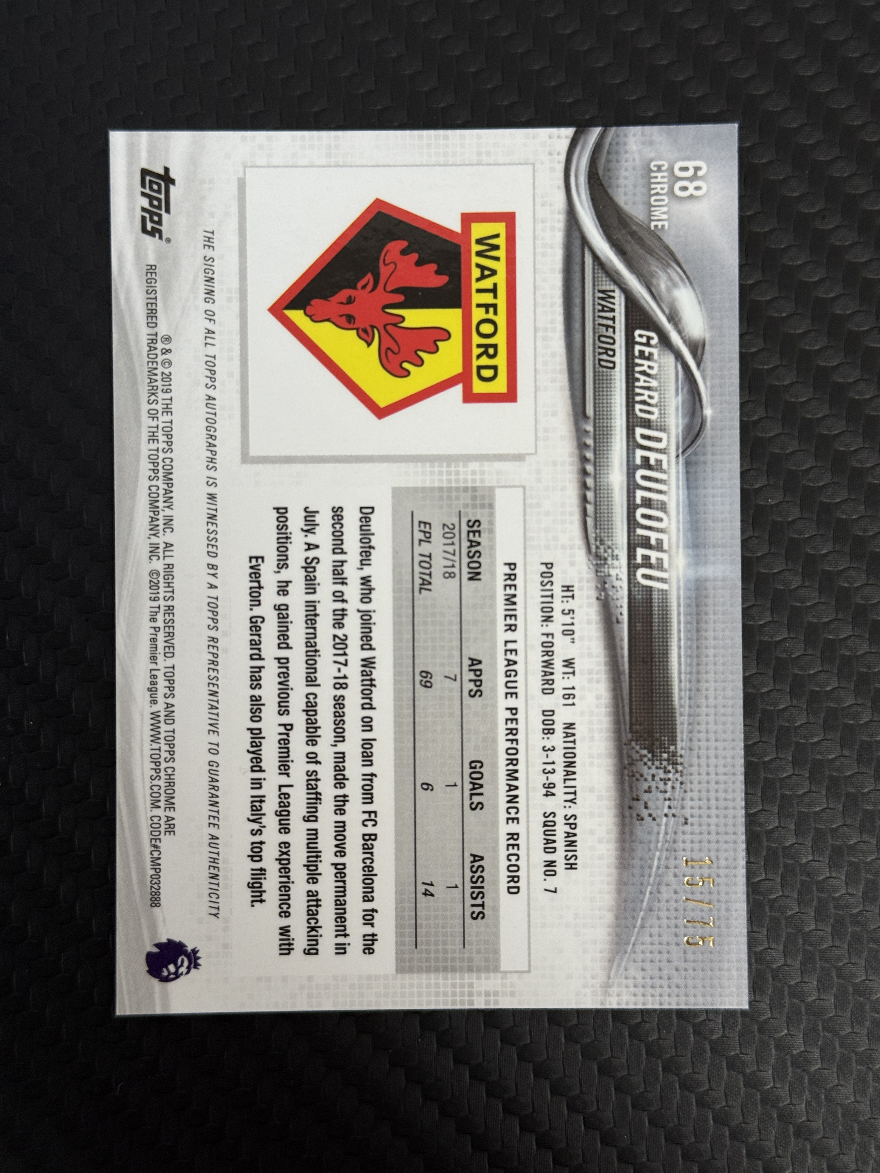 2018-19 Topps Premier Gerard Deulofeu 【包来拍卖】英超tc 元年 沃特福德 德乌洛费乌 签字 蓝波纹折 折射 75编 卡品如图 番茄飞