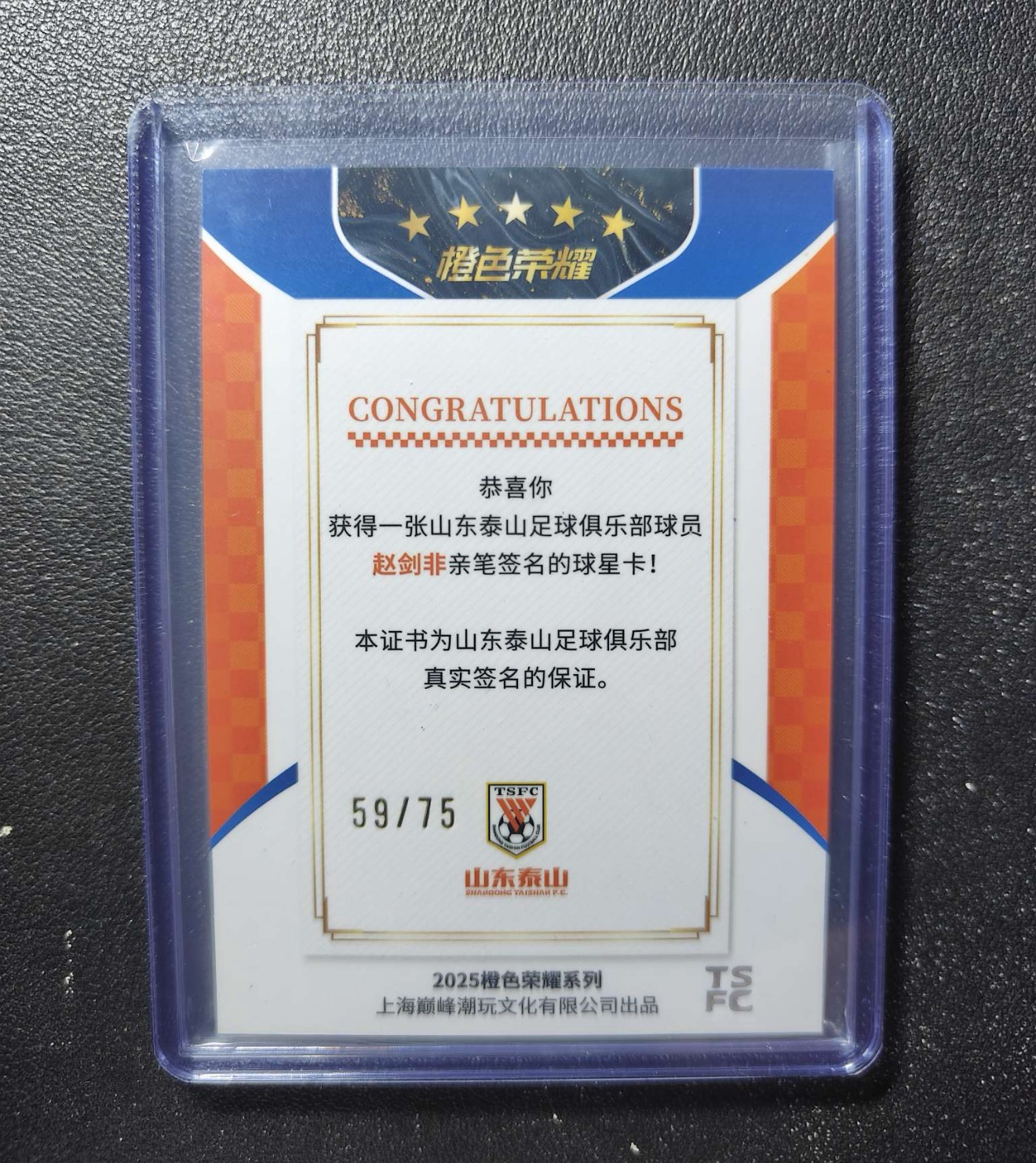2025 巅峰潮玩 橙色荣耀 山东泰山队盒 Zhao Jianfei 赵剑非 签字 卡签 山东泰山 59/75编 橙折 折射