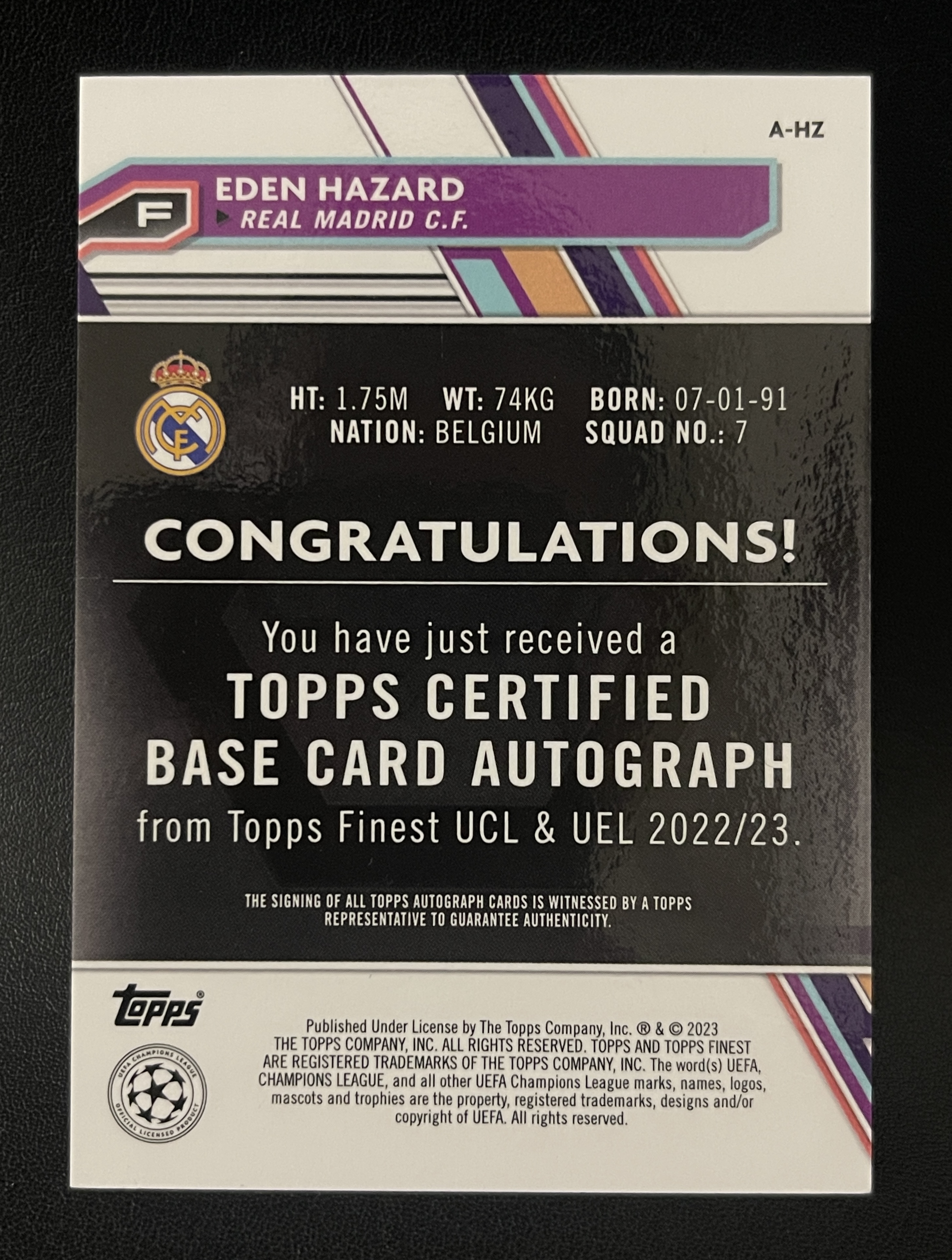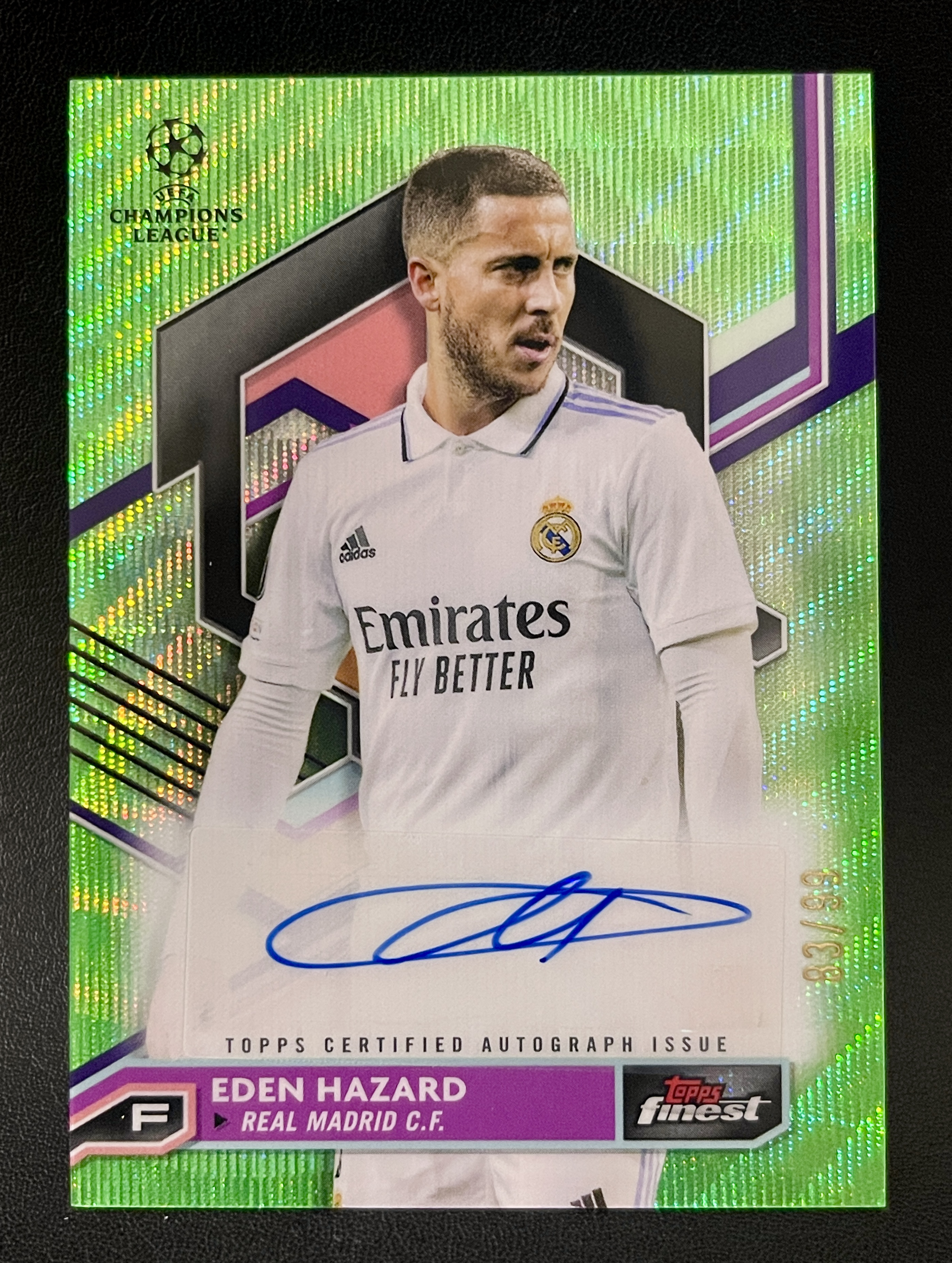 阿扎尔 2022-23 Topps Finest 欧冠 83/99编 绿波纹折 折射漂亮 亲笔签名 蓝字 墨迹完美 切尔西 皇马 比利时杨坤 值得收藏!