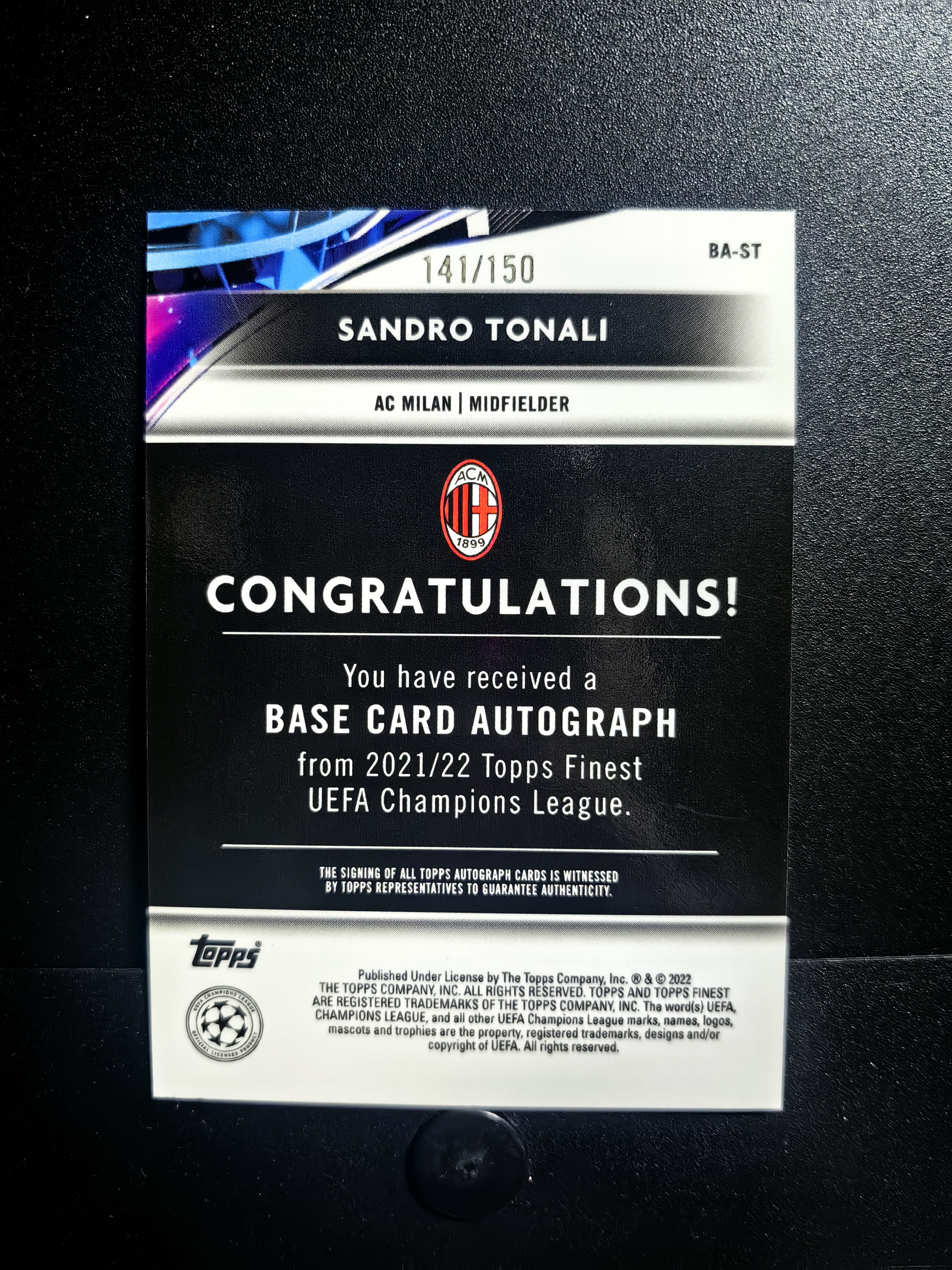2022 Topps Finest Sandro Tonali 【意甲专场】托纳利 /150编 签字 完美签字 AC米兰 实卡精美 中场大师