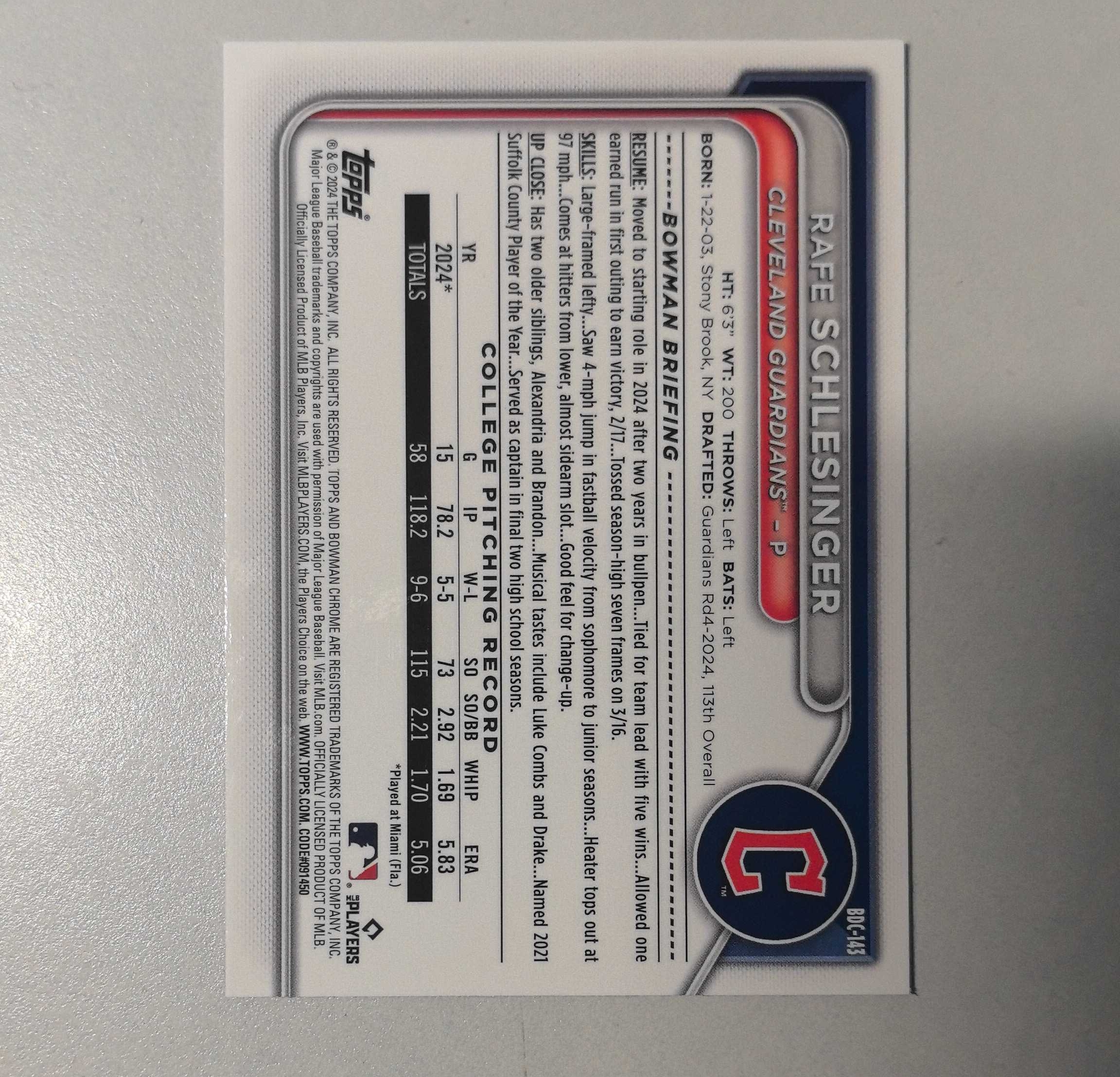 2024 Topps 【锡安代卖】 累计照常 bowman chrome 1st新秀base 紫折250编 克利夫兰守护者 Fafe Schlesinger 卡品如图 冉