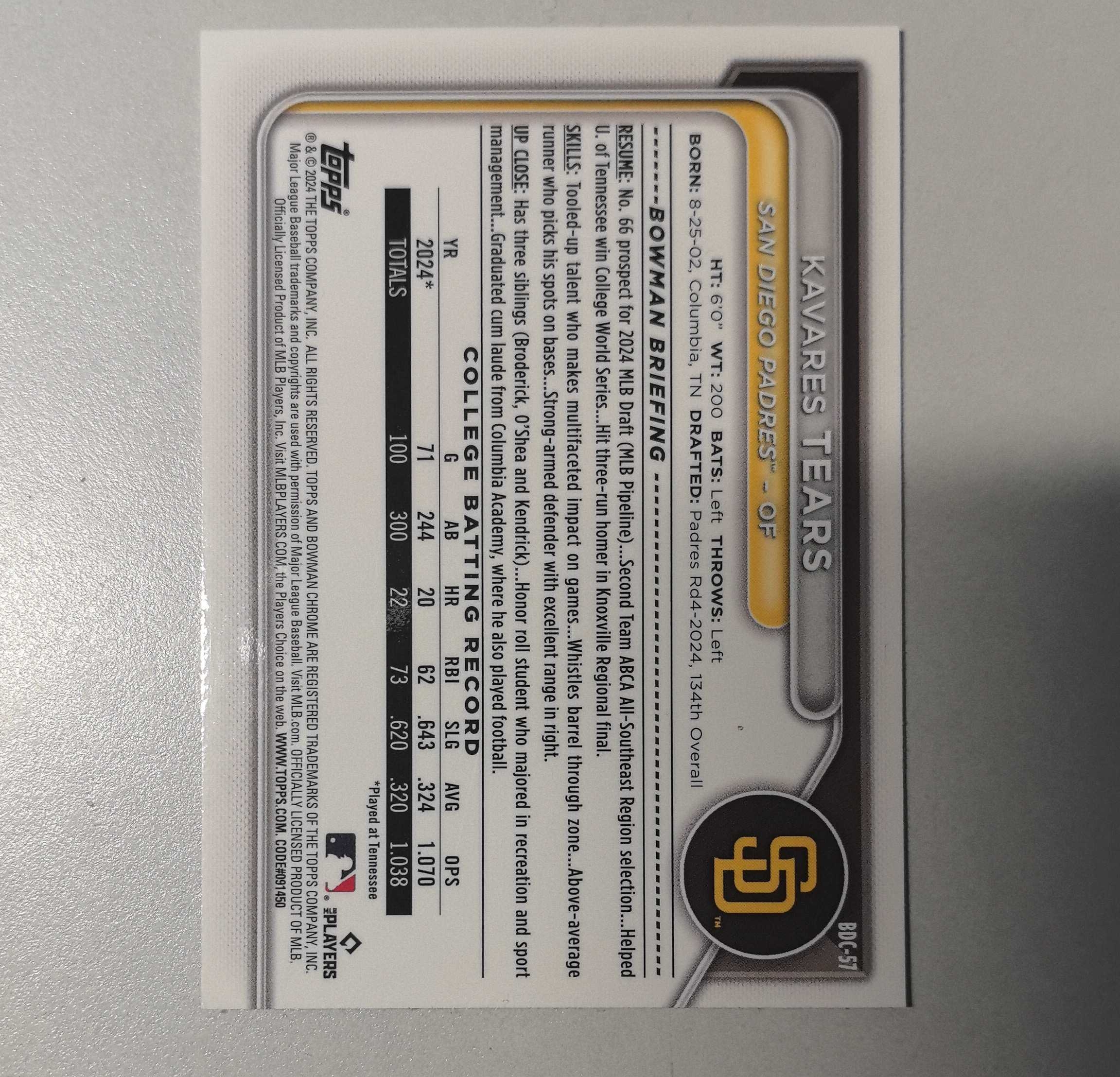 2024 Topps 【锡安代卖】 累计照常 Bowman chrome 1st新秀base 碎点折200编 圣迭戈教士 Kavares Tears 卡品如图 冉